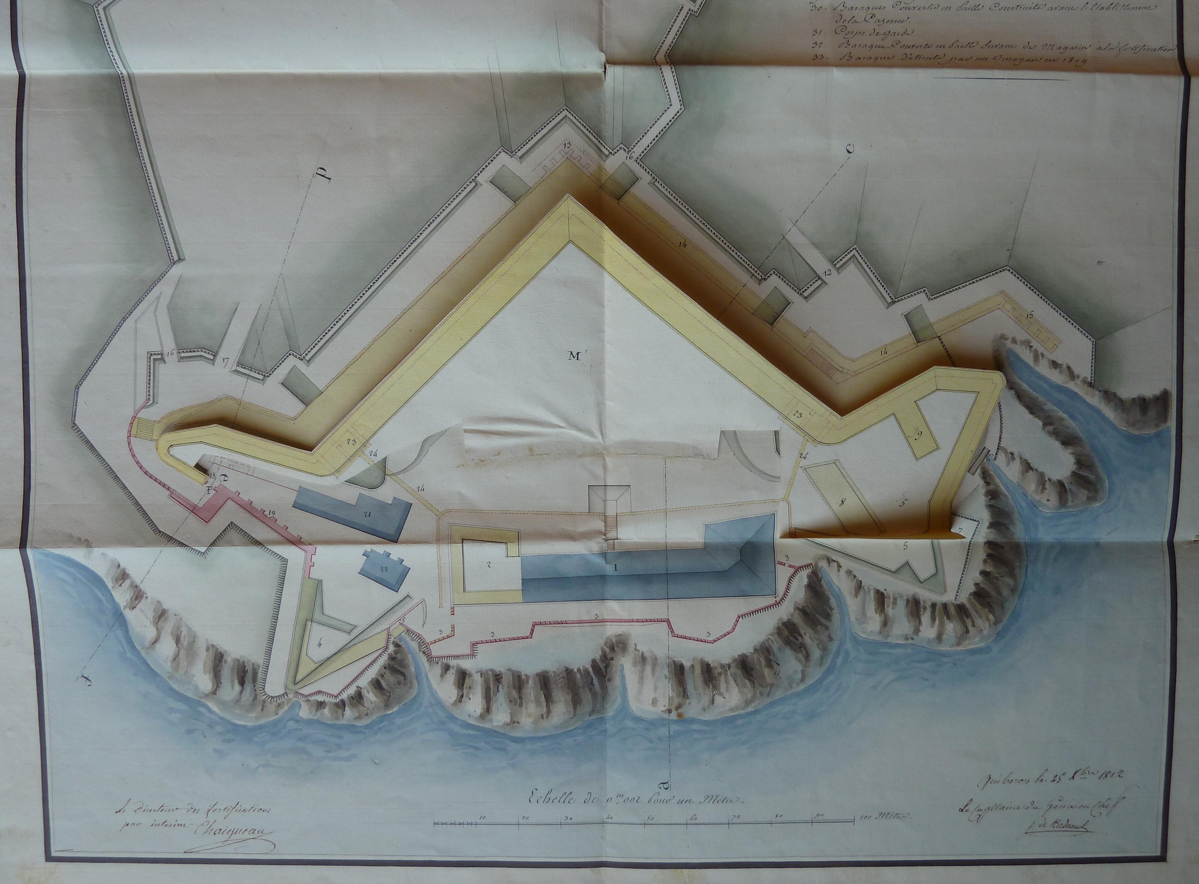 Service historique de la Défense, département Armée de Terre, Vincennes. Archives du Génie ; Article 8, Places françaises et d'Algérie : 1 VH 1515, Place de Quiberon, projets et dépenses annuels, 1747-1822. Direction du Génie de Port-Louis, Poste de Quiberon, plan du fort Penthièvre et de son camp retranché relatif aux projets pour 1813, 25 décembre 1812.
