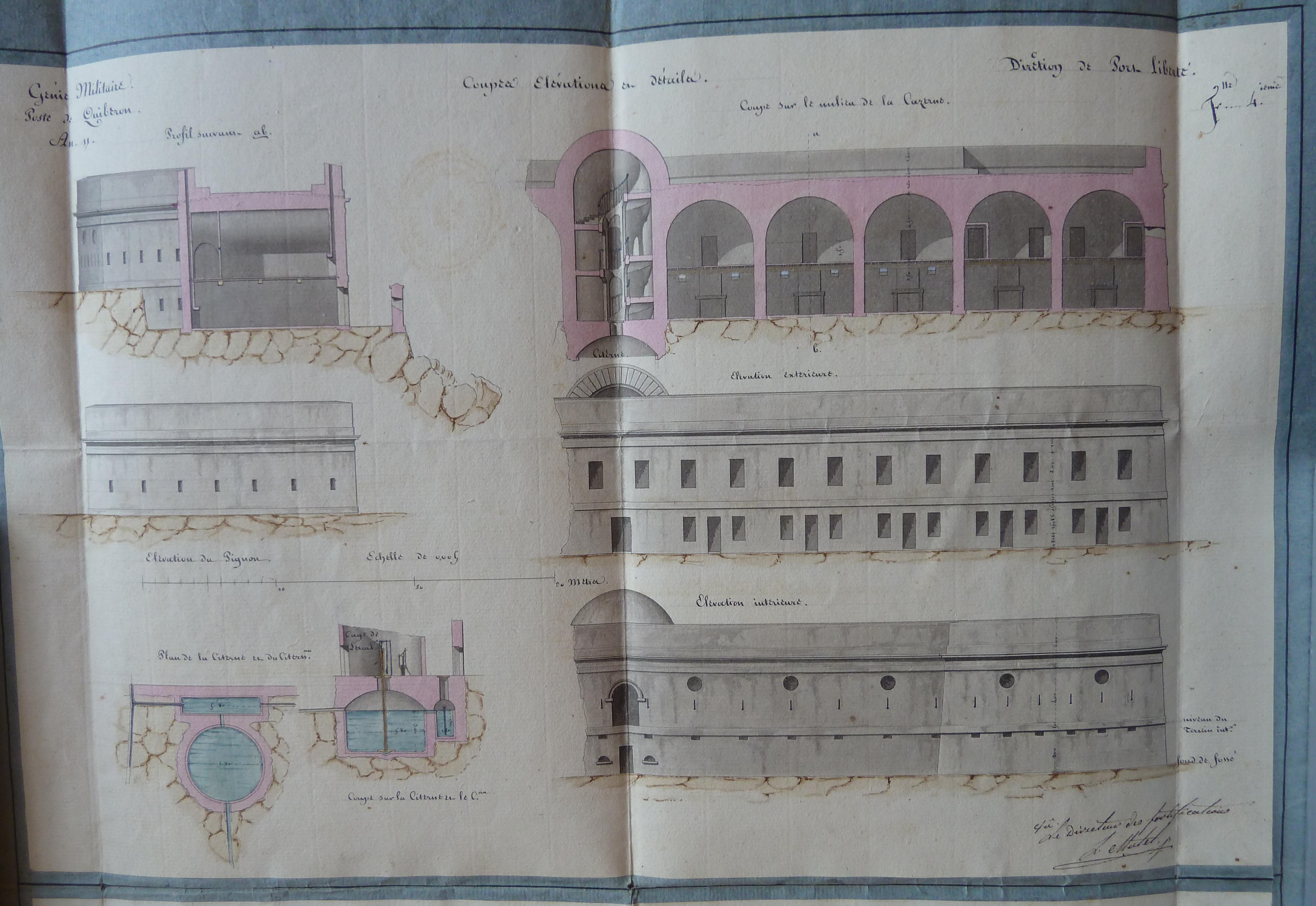 Service historique de la Défense, département Armée de Terre, Vincennes. Archives du Génie ; Article 8, Places françaises et d'Algérie : 1 VH 1515, Place de Quiberon, projets et dépenses annuels, 1747-1822. Direction du Génie de Port-Liberté, Poste de Quiberon, an 11 [1802-1803], élévations, coupes et plans de la caserne, des casemates à feux de revers, du corps de garde à construire au fort Penthièvre d'après la décision du ministre du 21 ventôse an 11 [13 mars 1803].