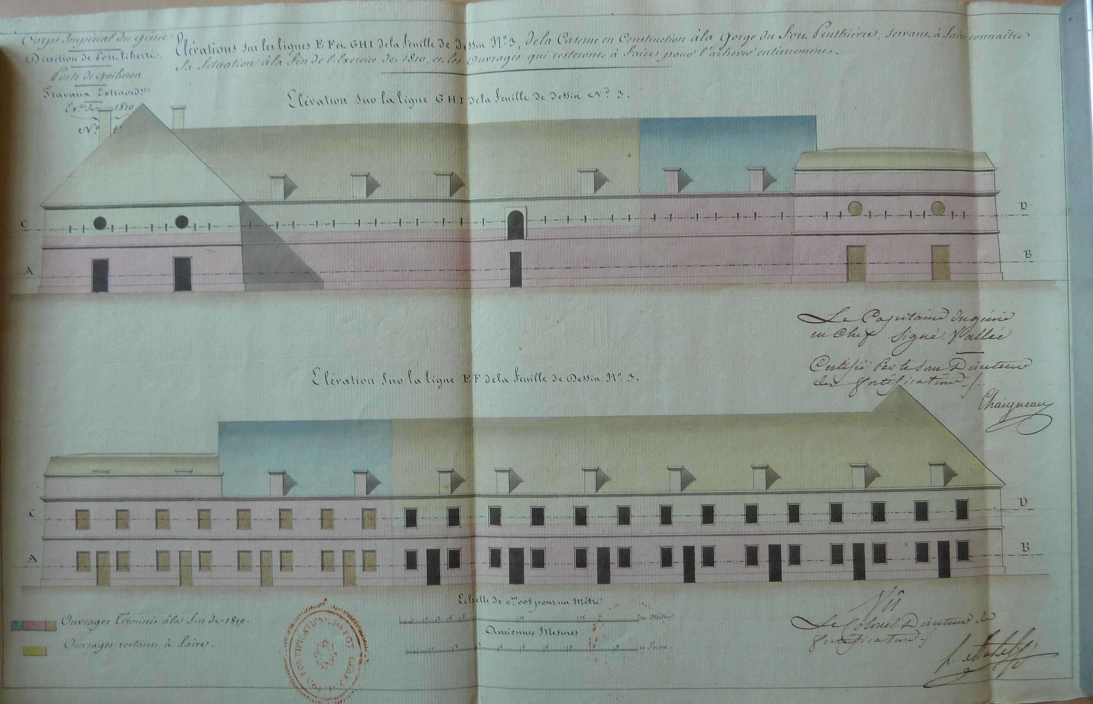 Service historique de la Défense, département Armée de Terre, Vincennes. Archives du Génie ; Article 8, Places françaises et d'Algérie : 1 VH 1515, Place de Quiberon, projets et dépenses annuels, 1747-1822. Direction du Génie de Port-Liberté, Poste de Quiberon, élévations de la caserne en construction à la gorge du fort Penthièvre, servant à faire connaître sa situation à la fin de l'année de 1810.