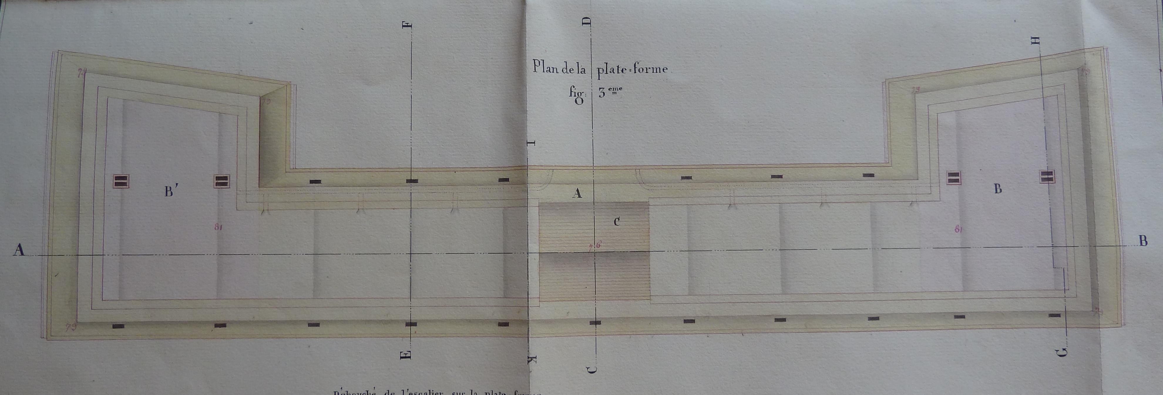 Service historique de la Défense, département Armée de Terre, Vincennes. Archives du Génie ; Article 8, Places françaises et d'Algérie : 1 VH 1516, Place de Quiberon, projets et dépenses annuels, 1823-1837. Direction du Génie de Port-Louis, Poste de Quiberon, feuille n° 1 des projets pour 1827, plan de la caserne défensive du fort Penthièvre, août 1826.