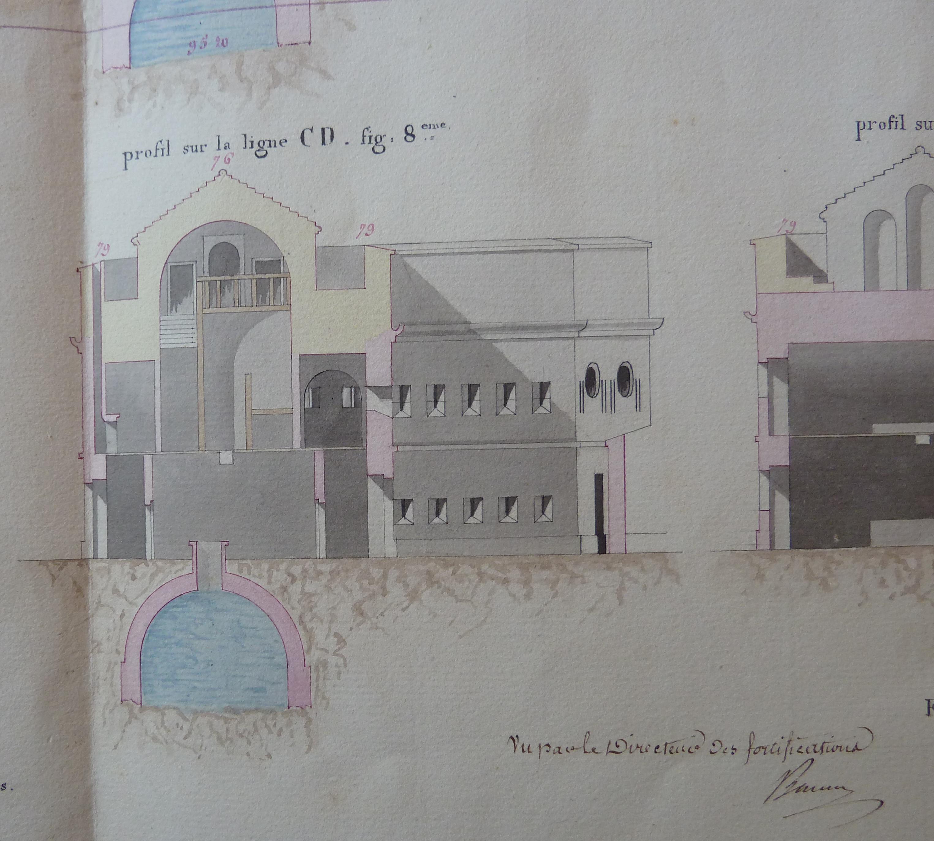 Service historique de la Défense, département Armée de Terre, Vincennes. Archives du Génie ; Article 8, Places françaises et d'Algérie : 1 VH 1516, Place de Quiberon, projets et dépenses annuels, 1823-1837. Direction du Génie de Port-Louis, Poste de Quiberon, feuille n° 2 des projets pour 1827, profils de la caserne défensive du fort Penthièvre, août 1826.