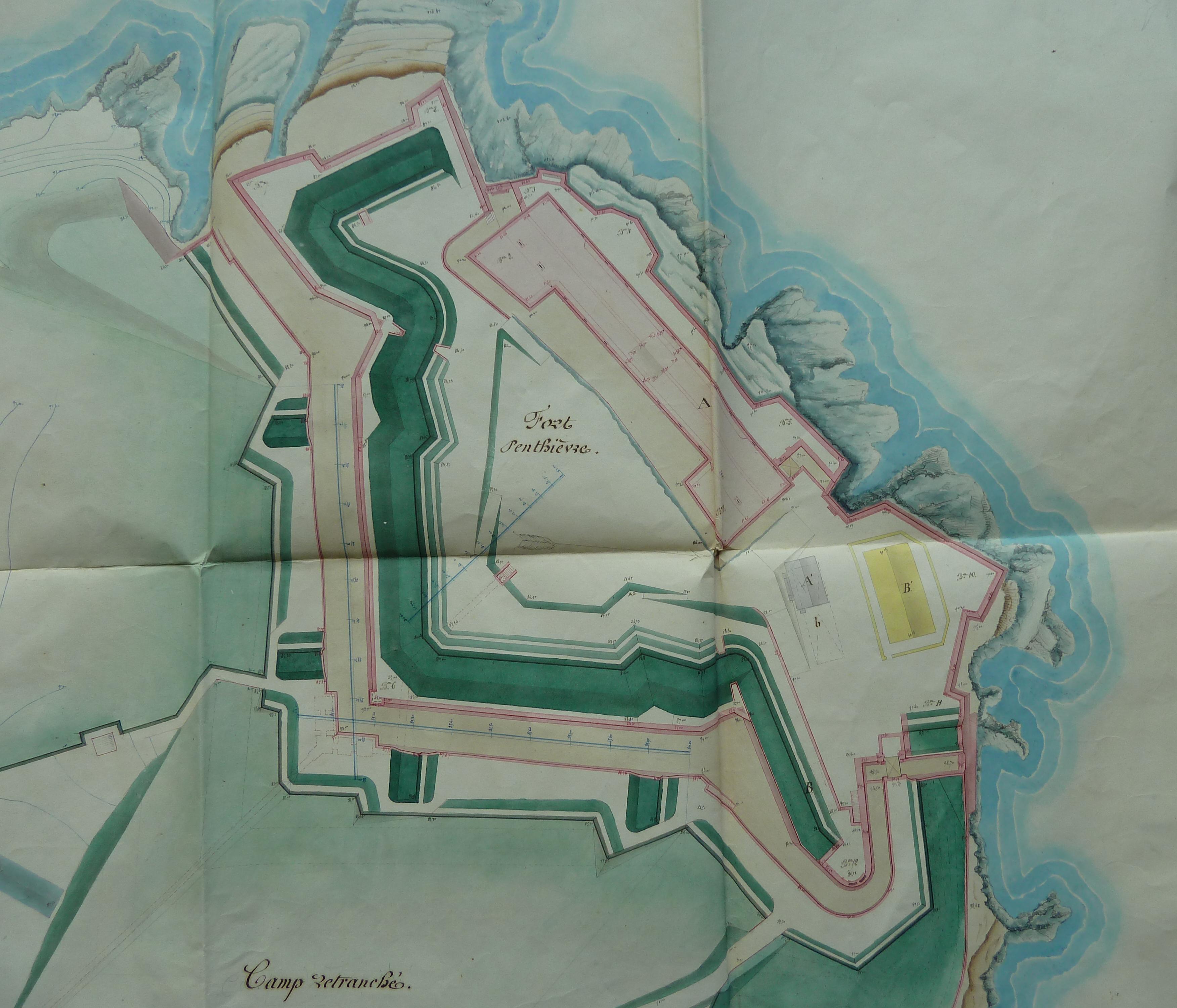 Service historique de la Défense, département Armée de Terre, Vincennes. Archives du Génie ; Article 8, Places françaises et d'Algérie : 1 VH 1518, Place de Quiberon, projets et dépenses annuels, 1847-1874. Direction du Génie de Nantes, Place de Quiberon, feuille n° 1 des projets pour 1849, état actuel des lieux, 26 janvier 1849.
