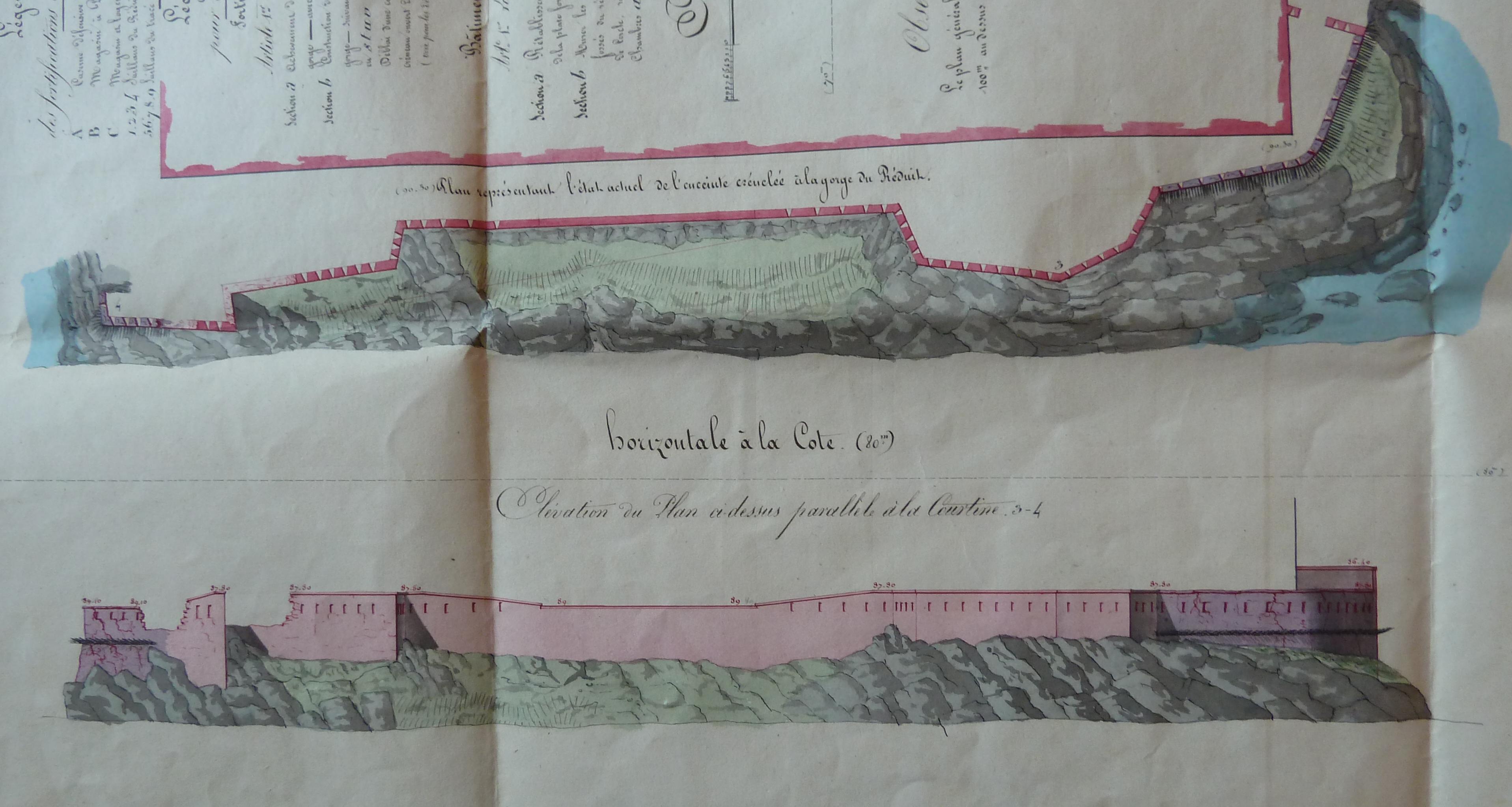 Service historique de la Défense, département Armée de Terre, Vincennes. Archives du Génie ; Article 8, Places françaises et d'Algérie : 1 VH 1516, Place de Quiberon, projets et dépenses annuels, 1823-1837. Direction du Génie de Nantes, Place de Quiberon, feuille des projets pour 1835, plan d'ensemble du fort, 10 avril 1835.