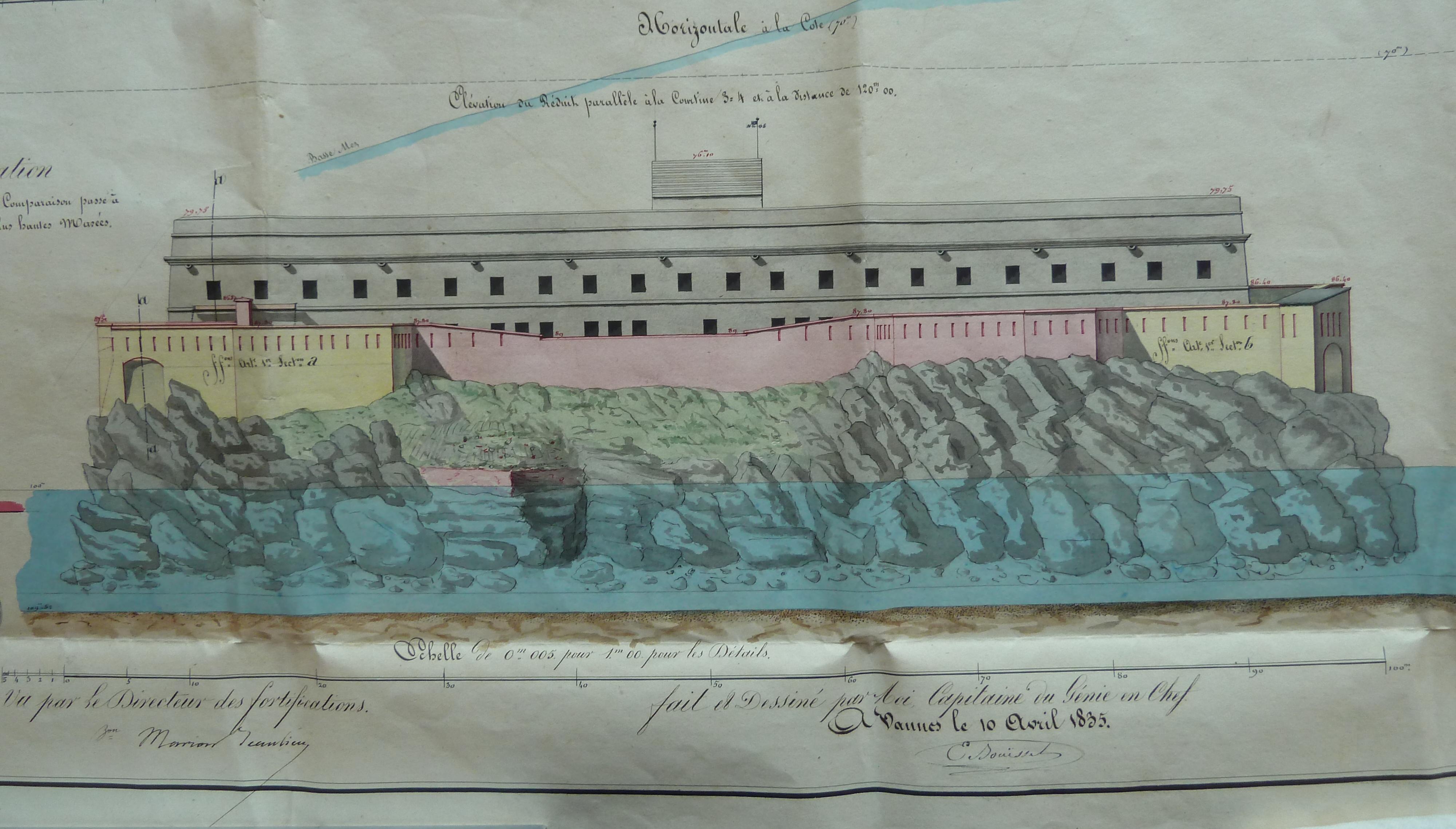Service historique de la Défense, département Armée de Terre, Vincennes. Archives du Génie ; Article 8, Places françaises et d'Algérie : 1 VH 1516, Place de Quiberon, projets et dépenses annuels, 1823-1837. Direction du Génie de Nantes, Place de Quiberon, feuille des projets pour 1835, plan d'ensemble du fort, 10 avril 1835.