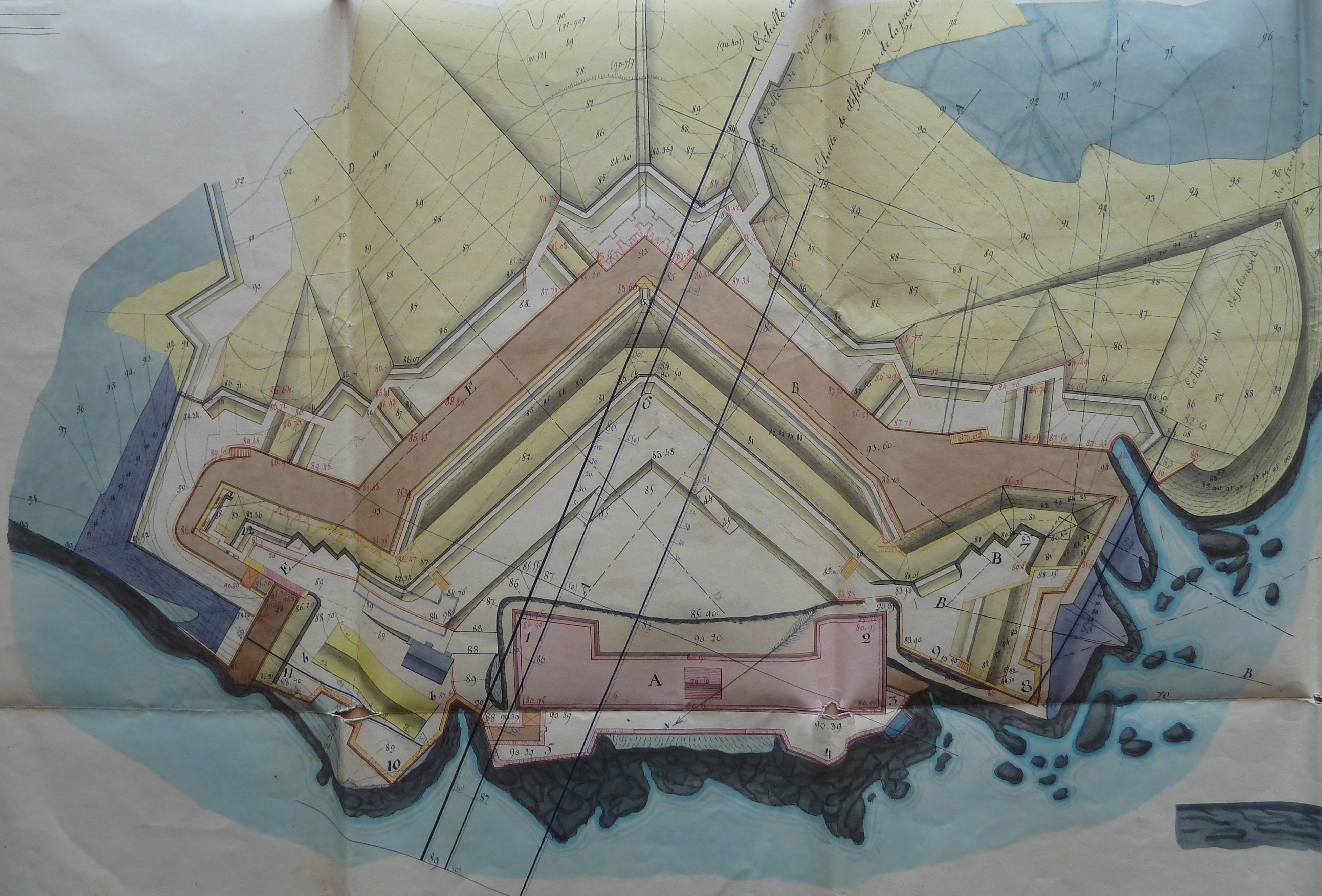 Service historique de la Défense, département Armée de Terre, Vincennes. Archives du Génie ; Article 8, Places françaises et d'Algérie : 1 VH 1516, Place de Quiberon, projets et dépenses annuels, 1823-1837. Direction du Génie de Nantes, Place de Quiberon, feuille des projets pour 1837, plan du projet général pour le corps de place du fort Penthièvre.