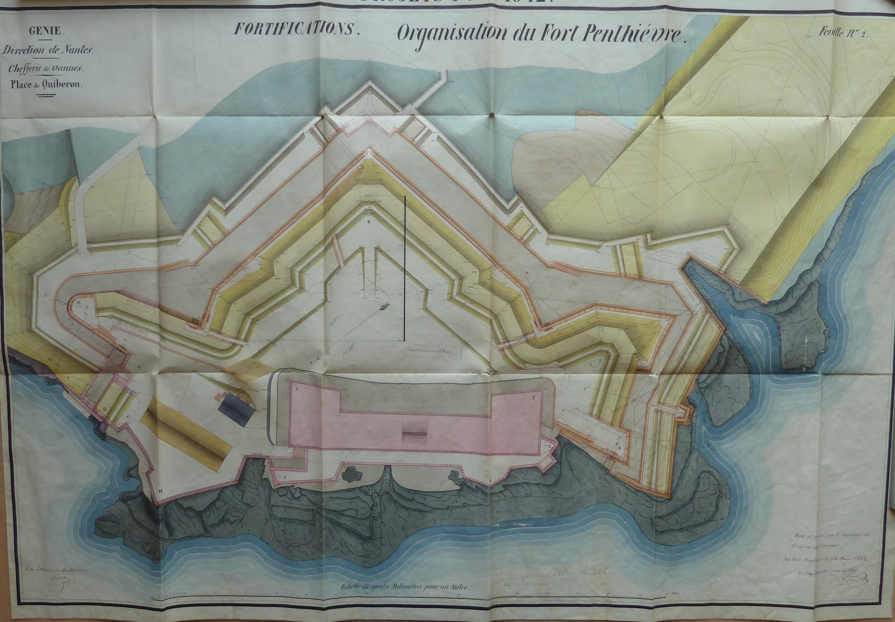 Service historique de la Défense, département Armée de Terre, Vincennes. Archives du Génie ; Article 8, Places françaises et d'Algérie : 1 VH 1517, Place de Quiberon, projets et dépenses annuels, 1838-1846. Direction du Génie de Nantes, Place de Quiberon, feuille n° 2 des projets pour 1842, organisation du fort Penthièvre, 22 mars 1842.
