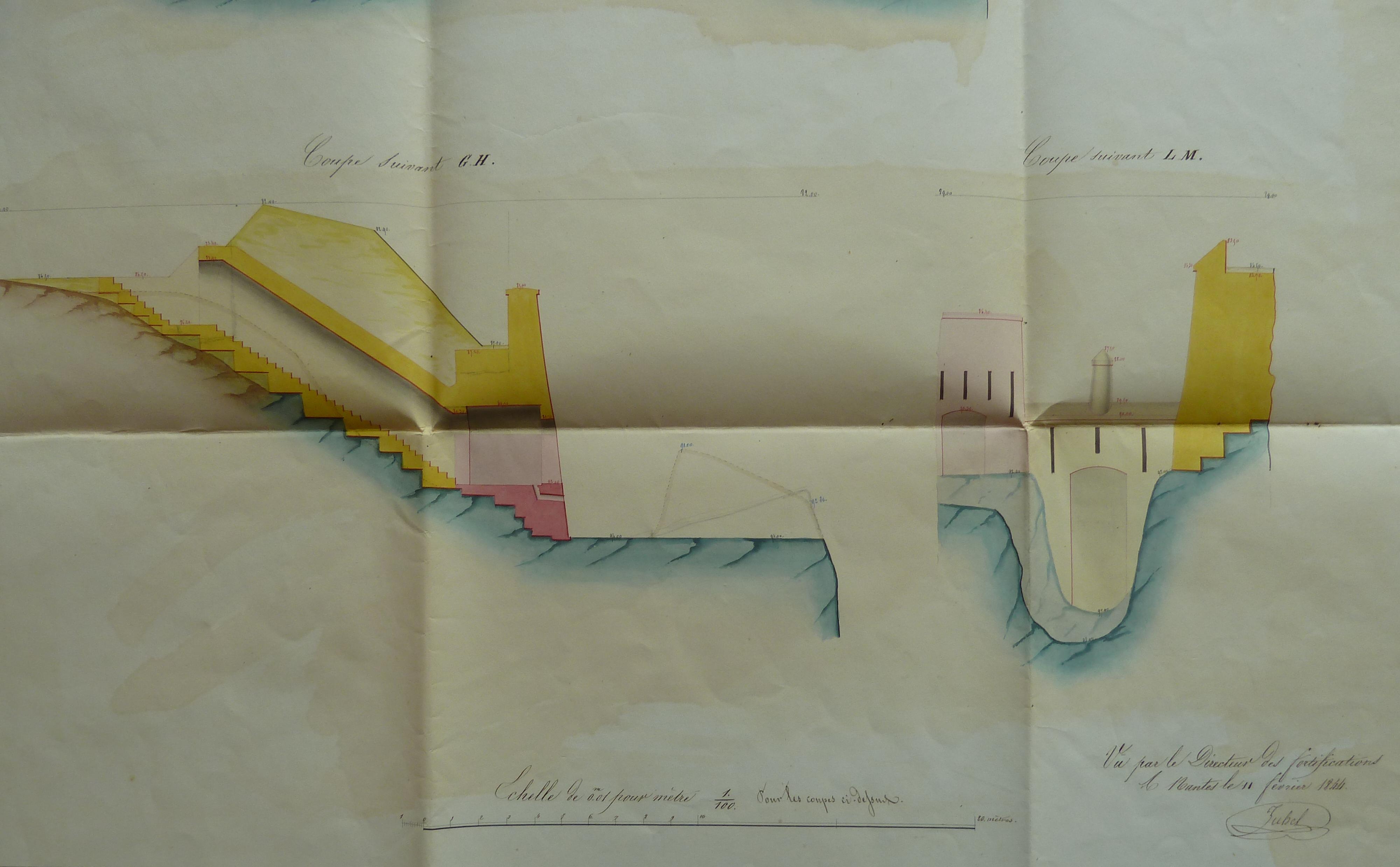 Service historique de la Défense, département Armée de Terre, Vincennes. Archives du Génie ; Article 8, Places françaises et d'Algérie : 1 VH 1517, Place de Quiberon, projets et dépenses annuels, 1838-1846. Direction du Génie de Nantes, Place de Quiberon, feuille n° 1 des projets pour 1844, redan 6, front 7-8, 1er février 1844.