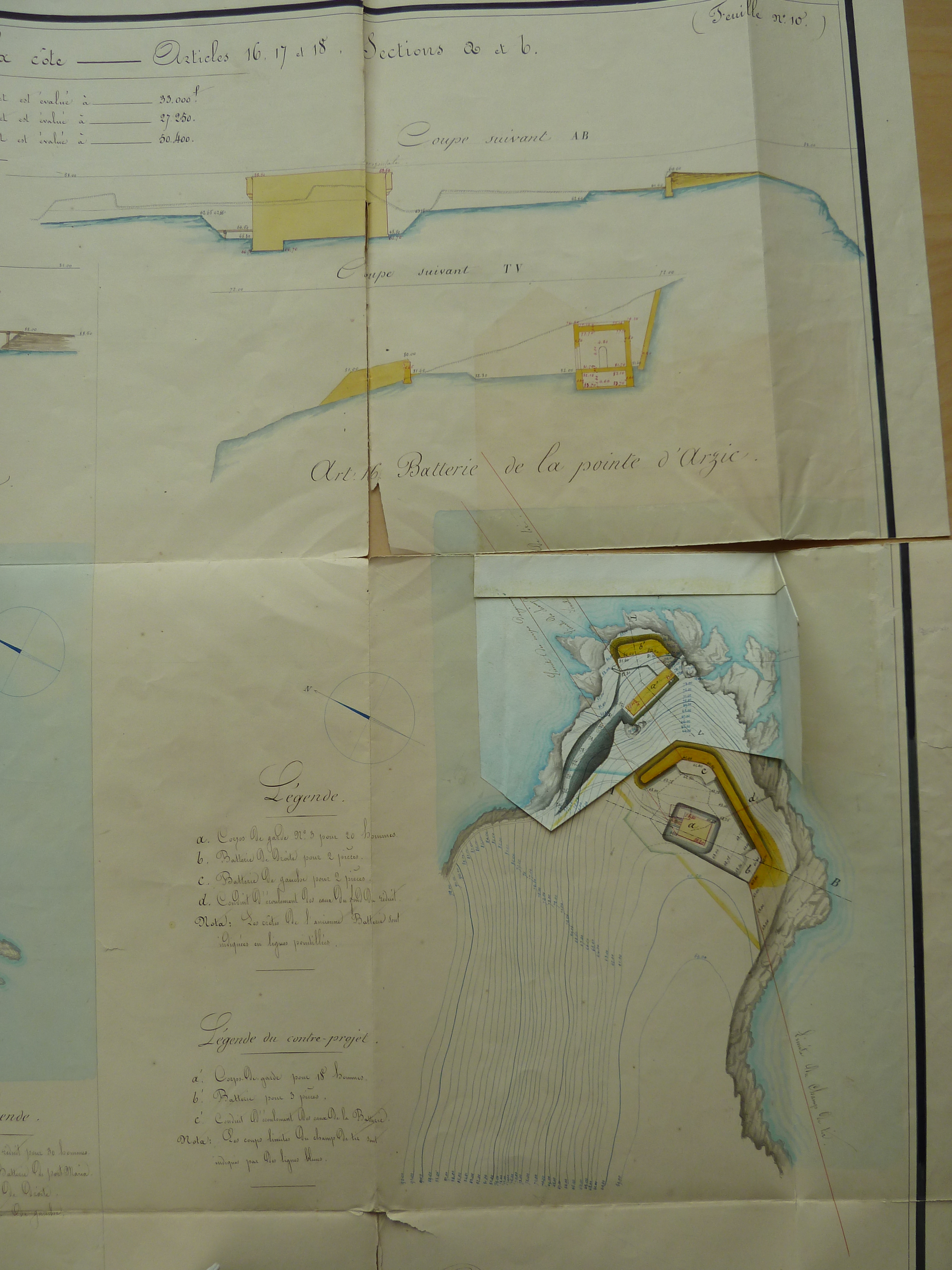 Service historique de la Défense, département Armée de Terre, Vincennes. Archives du Génie ; Article 8, Places françaises et d'Algérie : 1 VH 294, Place de Belle-Île-en-Mer, projets et dépenses annuels, 1854-1857. Direction du Génie de Brest, Place de Belle-Ile, feuille n° 10 des projets extraordinaires pour 1857-1858, batteries d'Arzic, postes garde-côtes de Port Maria et Port Andro, 19 février 1857 [papillote de correction du 18 mars 1857].
