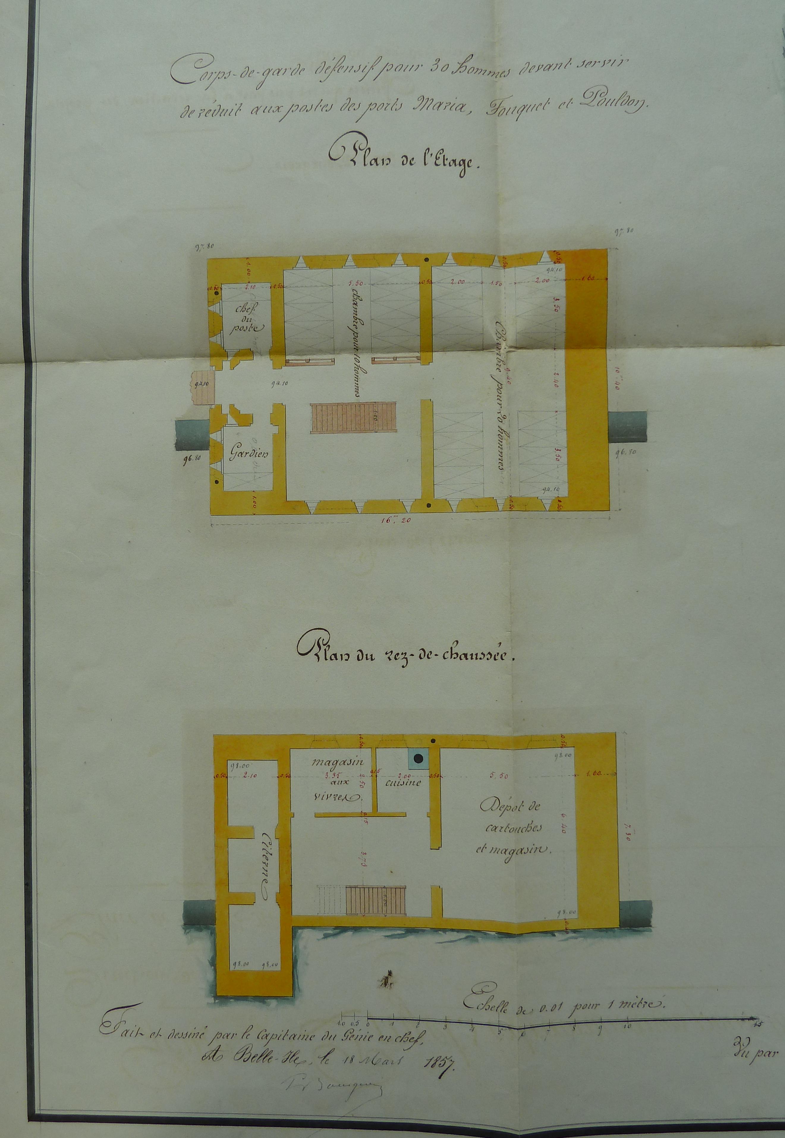 Service historique de la Défense, département Armée de Terre, Vincennes. Archives du Génie ; Article 8, Places françaises et d'Algérie : 1 VH 294, Place de Belle-Île-en-Mer, projets et dépenses annuels, 1854-1857. Direction du Génie de Brest, Place de Belle-Ile, feuille n° 23 des projets extraordinaires pour 1857-1858, détail des modifications apportées aux réduits types, 18 mars 1857.
