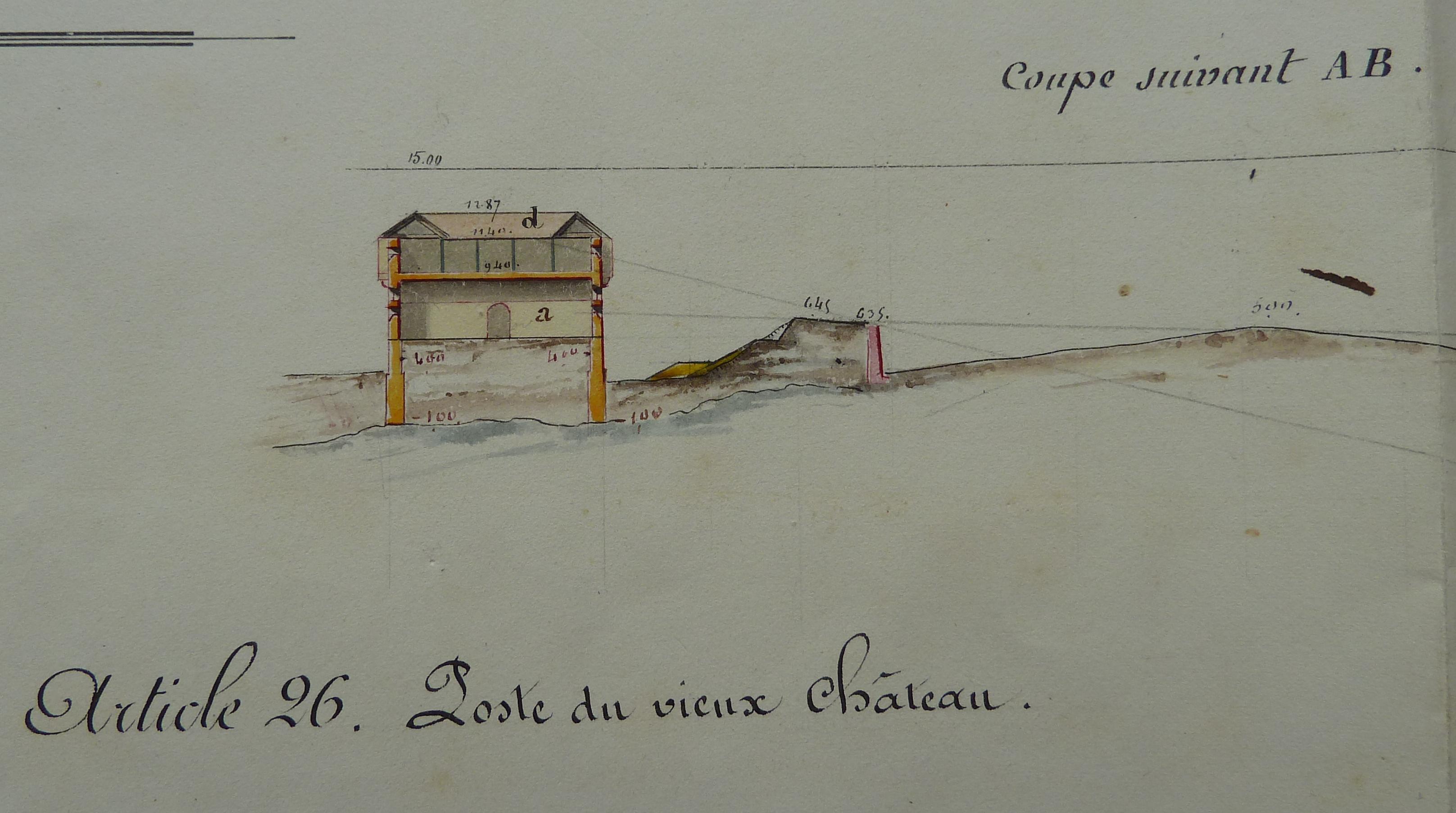 Service historique de la Défense, département Armée de Terre, Vincennes. Archives du Génie ; Article 8, Places françaises et d'Algérie : 1 VH 296, Place de Belle-Île-en-Mer, projets et dépenses annuels, 1860-1861. Direction du Génie de Brest, Place de Belle-Ile, feuille n° 14 des projets supplémentaires pour 1860-1861, postes gardes-côtes du Vieux Château et de Pouldon, 24 novembre 1860.