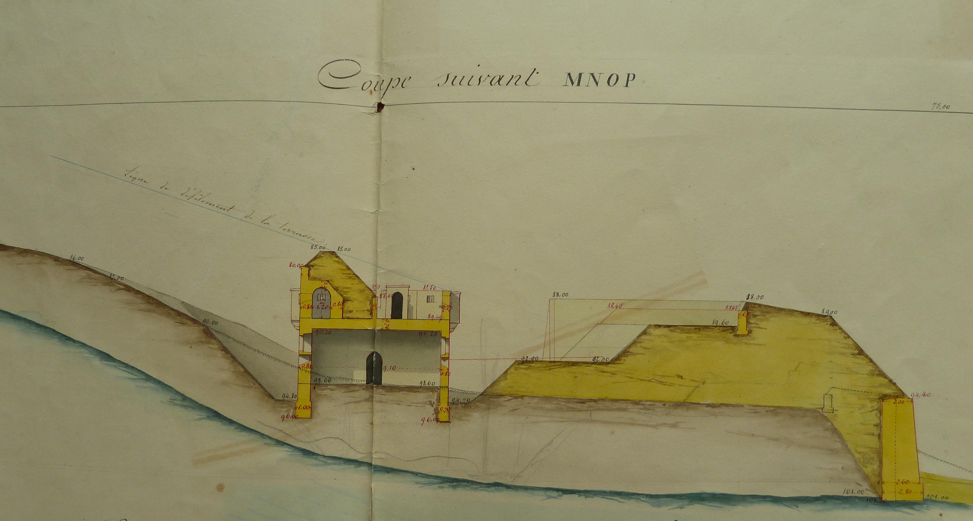 Service historique de la Défense, département Armée de Terre, Vincennes. Archives du Génie ; Article 8, Places françaises et d'Algérie : 1 VH 294, Place de Belle-Île-en-Mer, projets et dépenses annuels, 1854-1857. Direction du Génie de Brest, Place de Belle-Ile, feuille n° 11 des projets extraordinaires pour 1857-1858, batteries de Kerdonis, de La Biche et de La Ferrière, 19 février 1857 [papillote de correction du 18 mars 1857].