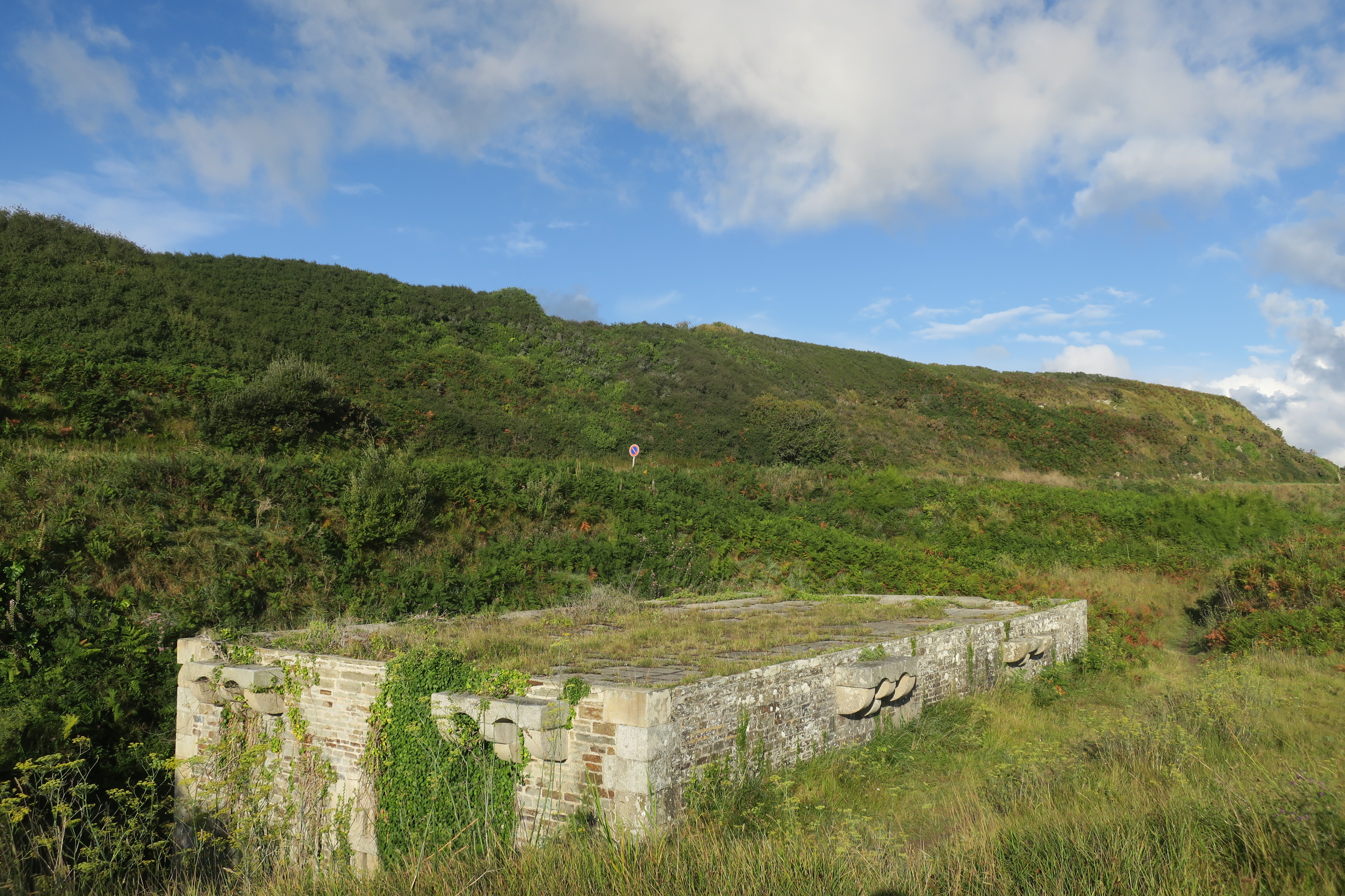 Locmaria, Grands Sables, batterie de La Ferrière, corps de garde crénelé, angle nord-est.Immatriculation