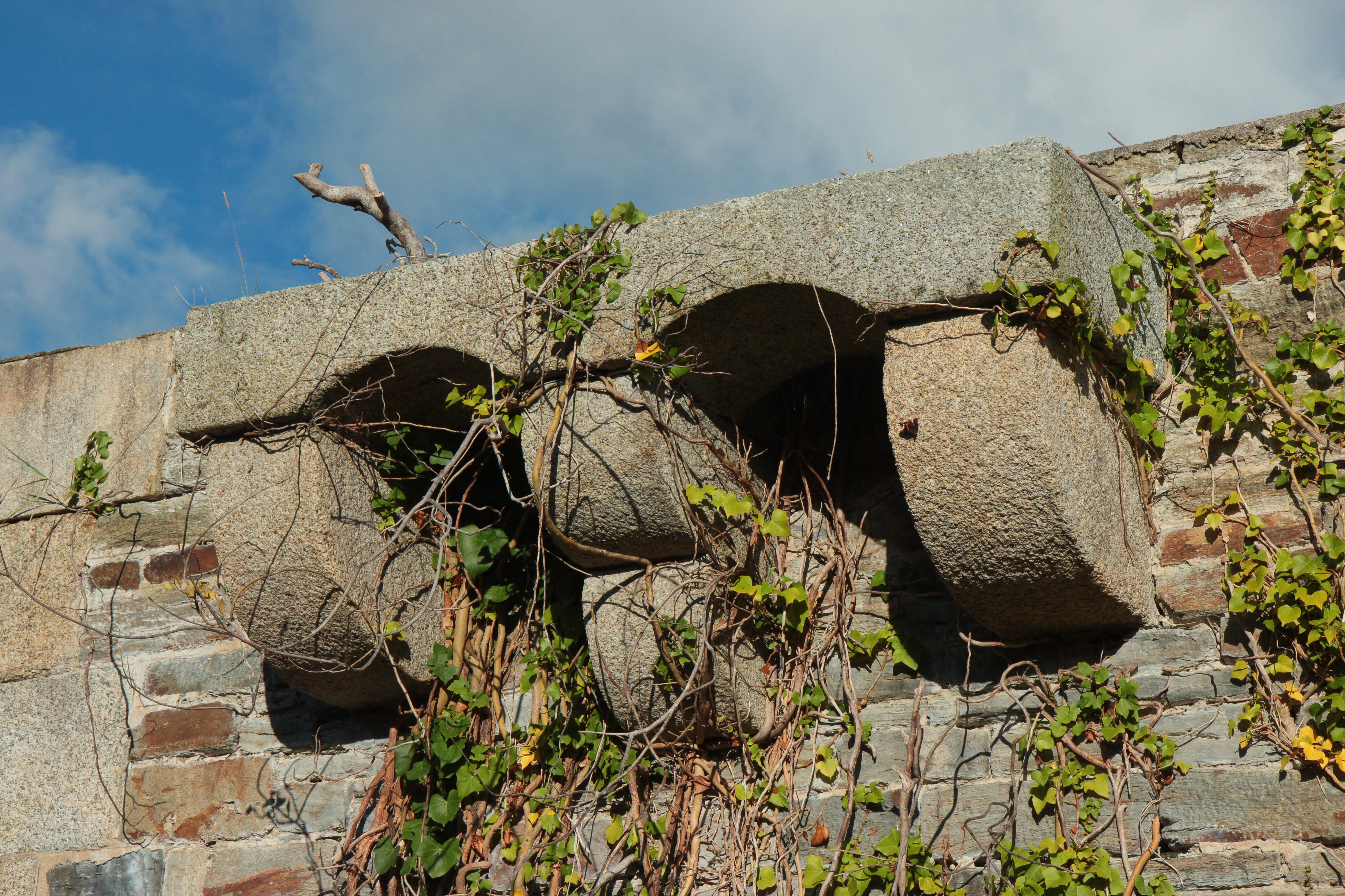 Locmaria, Grands Sables, batterie de La Ferrière, corps de garde crénelé, vestige de bretèche.Immatriculation