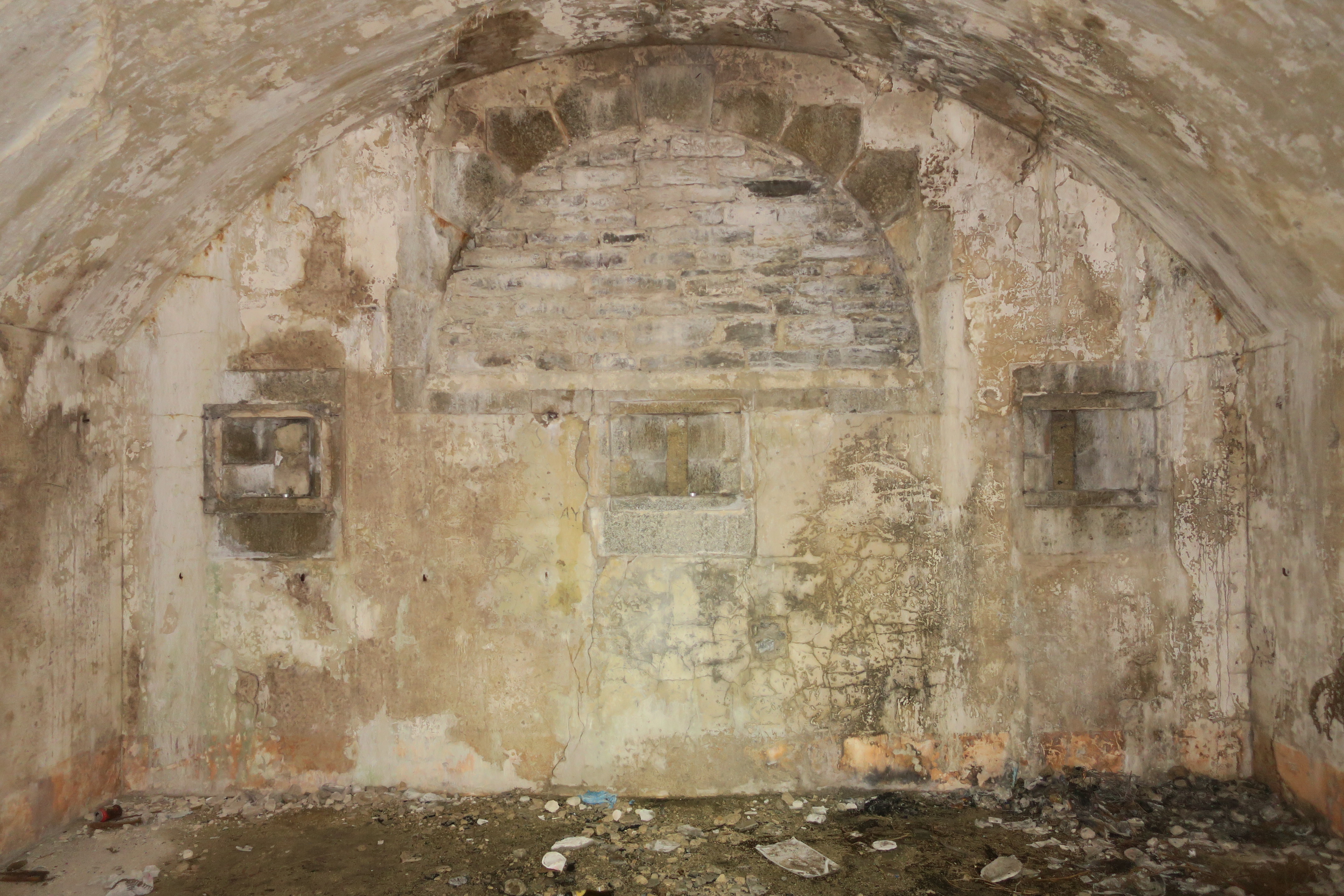 Locmaria, Grands Sables, batterie de La Ferrière, corps de garde crénelé, créneaux de tir et baie obturée.Immatriculation