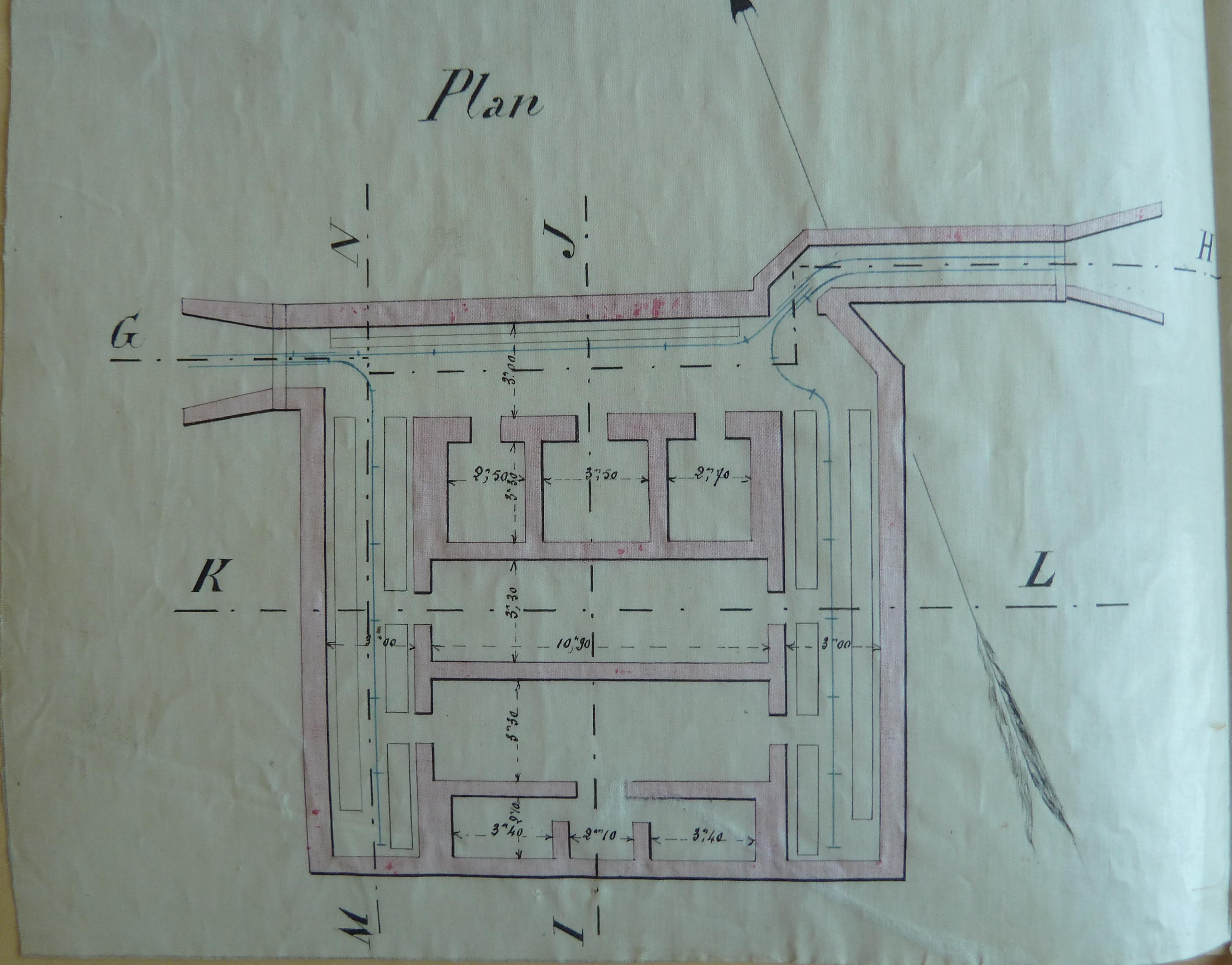 Service historique de la Défense, Département Armée de Terre, Vincennes. Archives de la Guerre, Troisième République ; Sous-série 7 N, État-major de l'Armée : 7 N 1904, Défense des fronts de mer, dossiers de l’inspection générale permanente d’armement des côtes - Atlantique : pièces collectives, Belle-Ile, Blaye, Bordeaux, Brest (1878-1912). Croquis joint au procès-verbal de conférence en date du 30 décembre 1894 relatif à l'emmagasinement des munitions dans les batteries de côte de Belle-Ile.