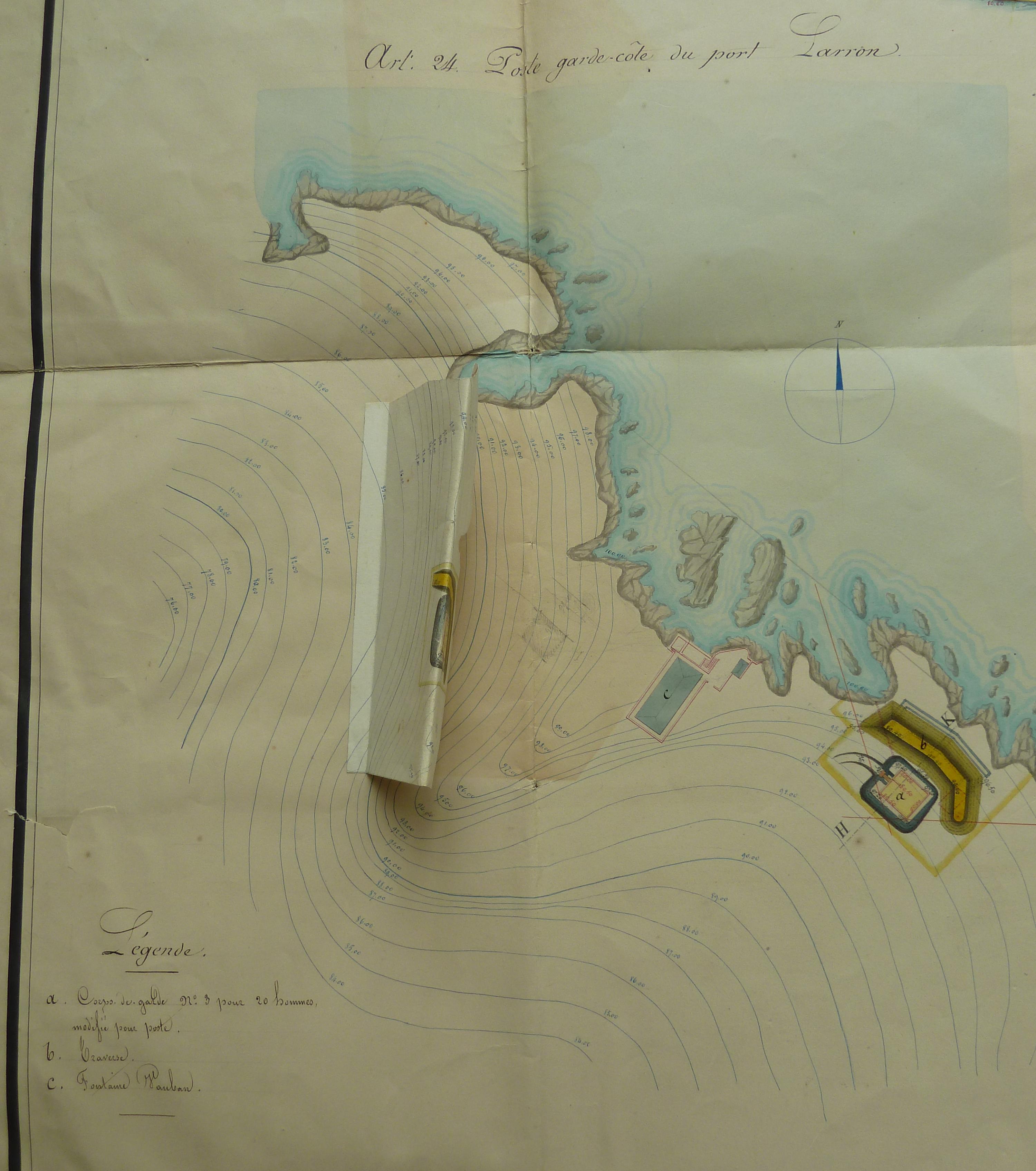 Service historique de la Défense, département Armée de Terre, Vincennes. Archives du Génie ; Article 8, Places françaises et d'Algérie : 1 VH 294, Place de Belle-Île-en-Mer, projets et dépenses annuels, 1854-1857. Direction du Génie de Brest, Place de Belle-Ile, feuille n° 12 des projets extraordinaires pour 1857, 19 février 1857 [papillote de correction du 18 mars 1857].