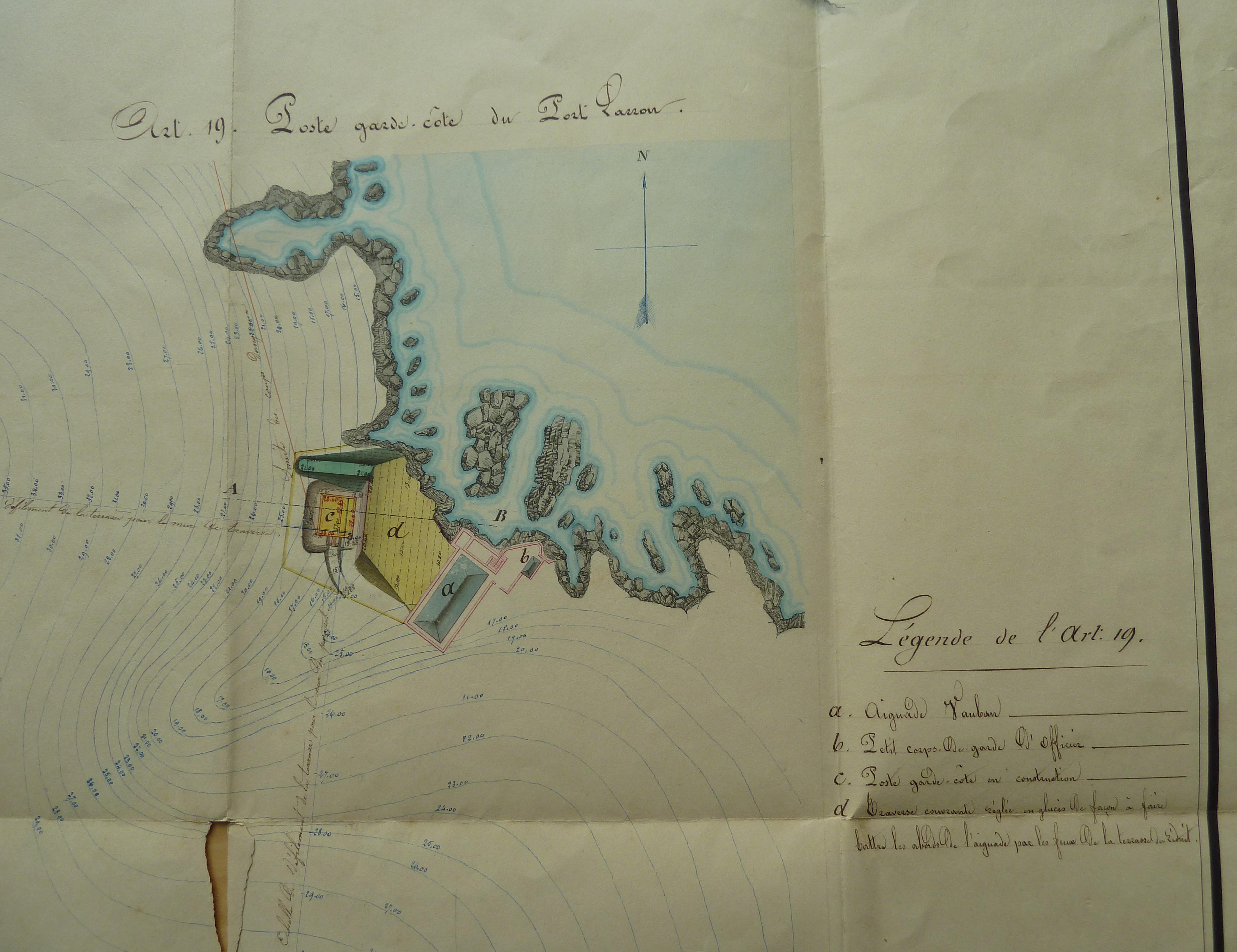 Service historique de la Défense, département Armée de Terre, Vincennes. Archives du Génie ; Article 8, Places françaises et d'Algérie : 1 VH 296, Place de Belle-Île-en-Mer, projets et dépenses annuels, 1860-1861. Direction du Génie de Brest, Place de Belle-Ile, feuille n° 12 des projets pour 1860-1861, poste garde-côte du Port Larron, batteries de Ramonet et de Taillefer, 20 novembre 1859.