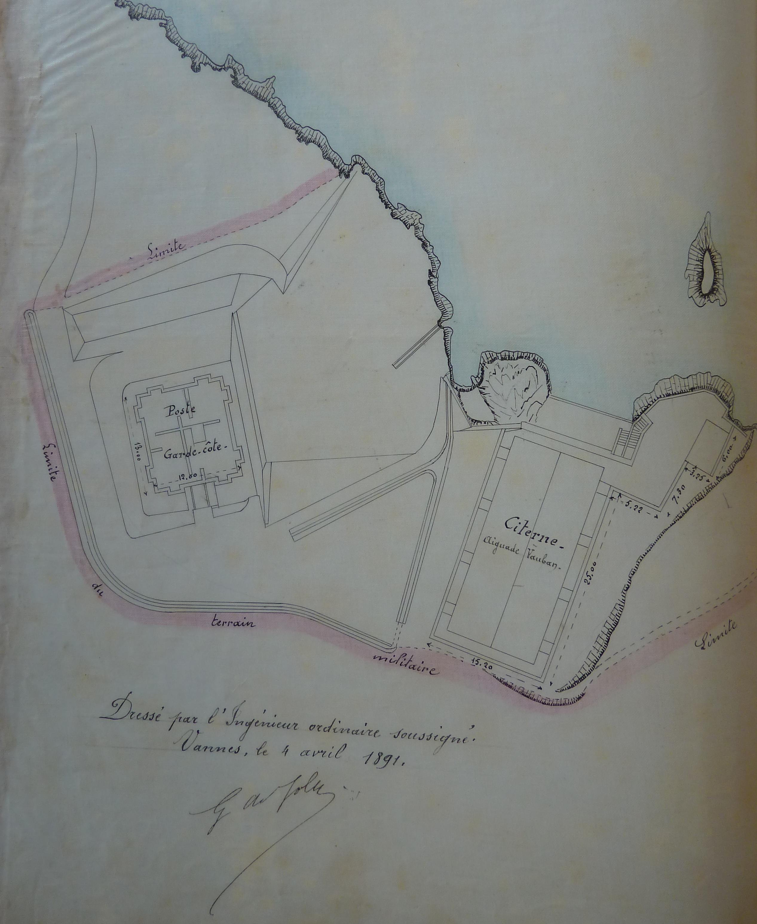 Archives départementales du Morbihan. Série Q, Domaines : Q 370 [cote provisoire], Bureau des Domaines de Belle-Île. Ponts et Chaussées, affectation au département des Travaux Publics d'ouvrages militaires déclassés, plan de la batterie de Port-Larron et de l'aiguade Vauban, 10 juin 1891.
