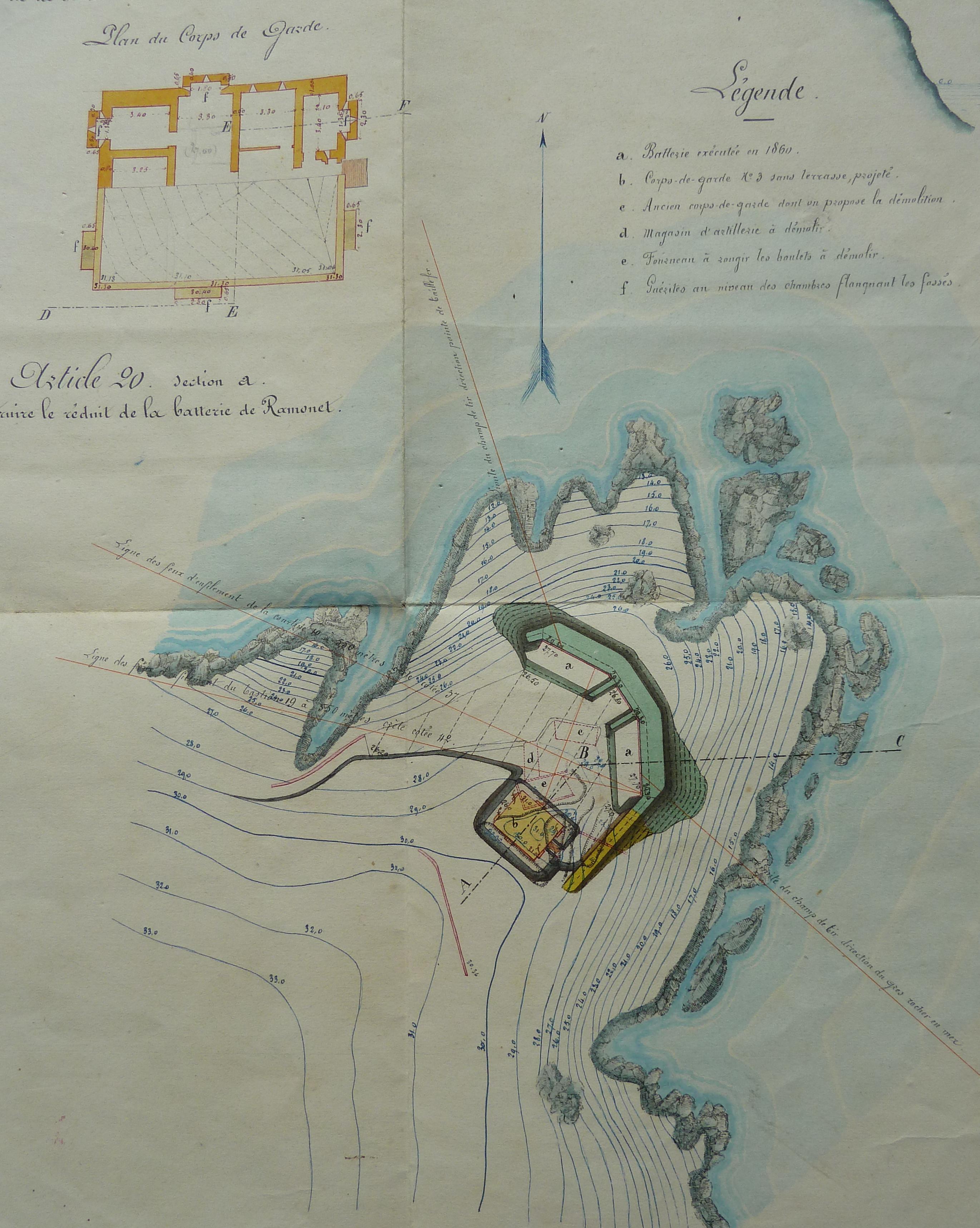 Service historique de la Défense, département Armée de Terre, Vincennes. Archives du Génie ; Article 8, Places françaises et d'Algérie : 1 VH 296, Place de Belle-Île-en-Mer, projets et dépenses annuels, 1860-1861. Direction du Génie de Brest, Place de Belle-Ile, feuille n° 11 des projets supplémentaires pour 1860-1861, batterie de Ramonet, batterie du Vésuve, bastion 4 de la citadelle, 24 novembre 1860.