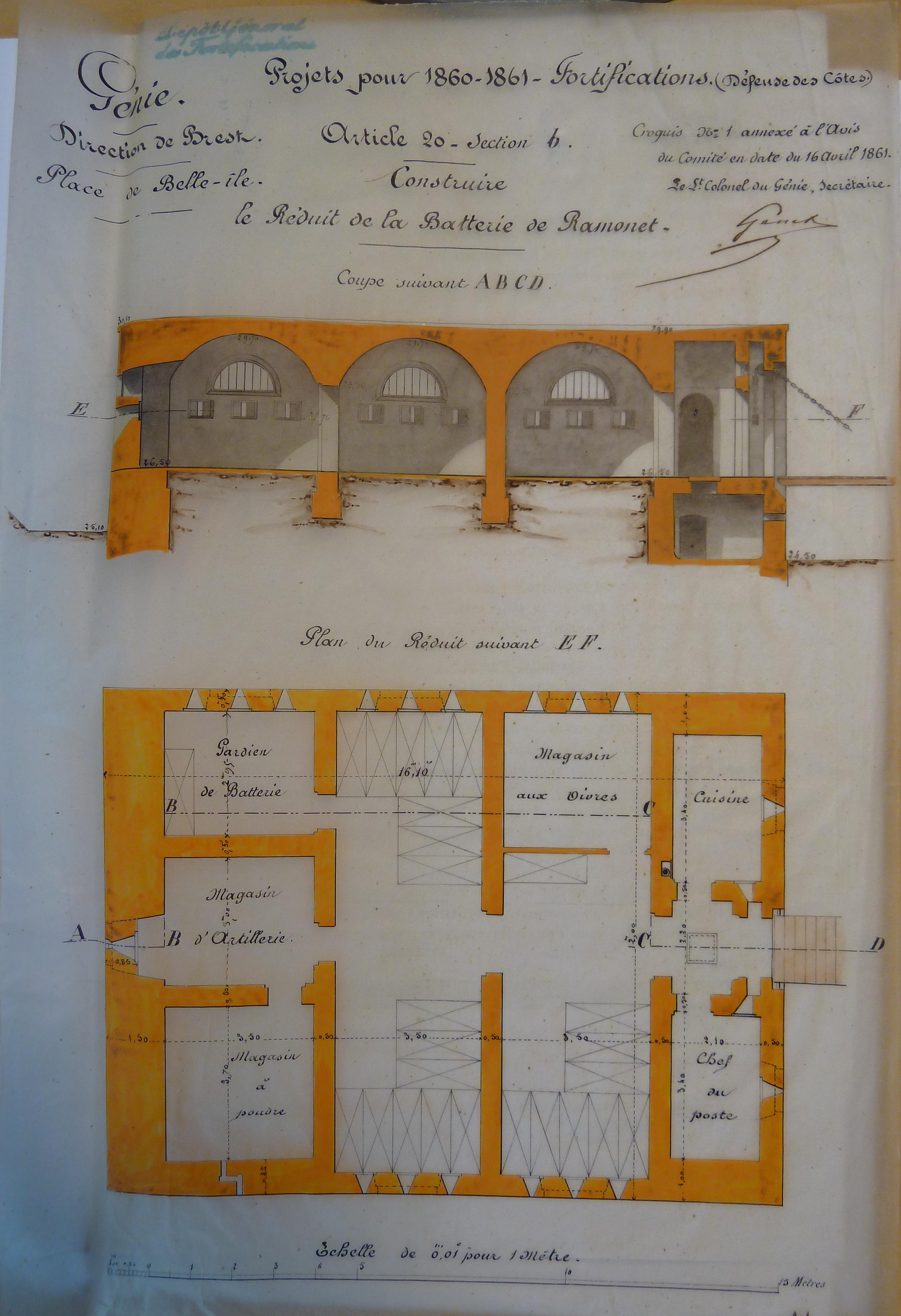 Service historique de la Défense, département Armée de Terre, Vincennes. Archives du Génie ; Article 12, Avis du Comité : 1 VK 534, Croquis annexés aux avis du Comité, Bellegarde, Belle-Île-en-Mer, Bergues (1818-1885). Croquis n° 1 annexé à l'avis du Comité en date du 16 avril 1861, construire le réduit de la batterie de Ramonet.