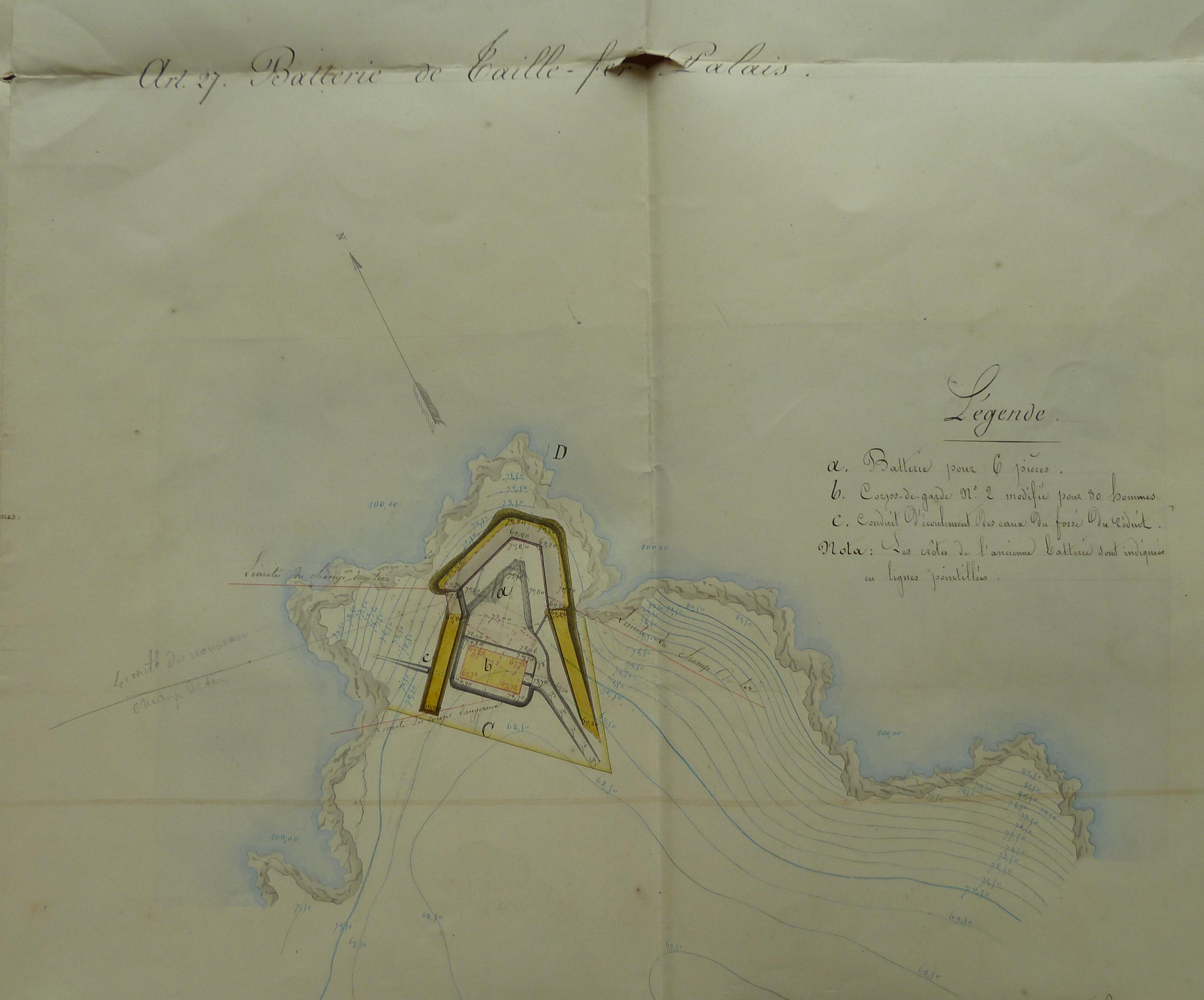 Service historique de la Défense, département Armée de Terre, Vincennes. Archives du Génie ; Article 8, Places françaises et d'Algérie : 1 VH 294, Place de Belle-Île-en-Mer, projets et dépenses annuels, 1854-1857. Direction du Génie de Brest, Place de Belle-Ile, feuille n° 14 des projets extraordinaires pour 1857-1858, 19 février 1857 [papillotte de correction du 18 mars 1857].