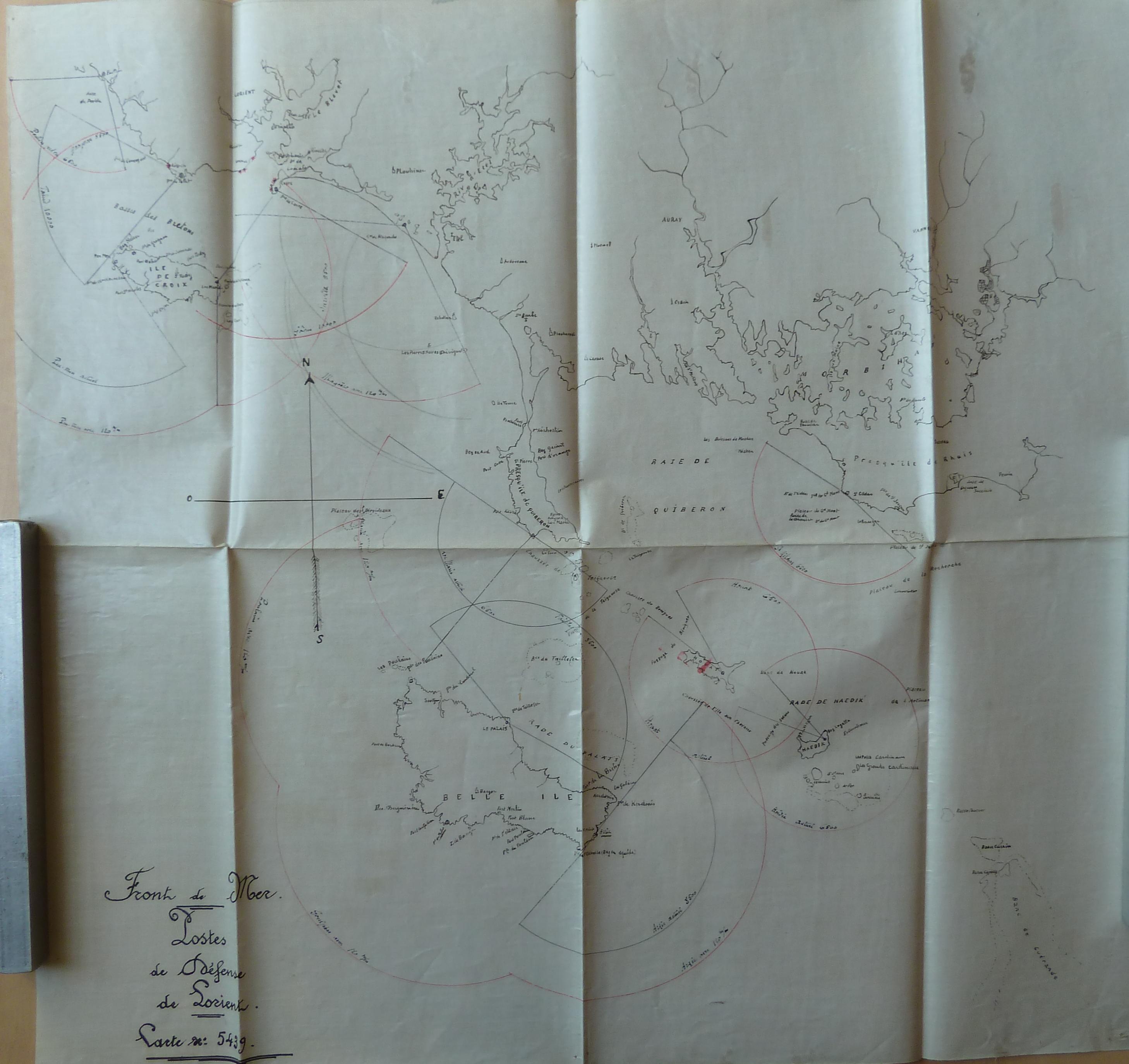 Service historique de la Défense, Département Marine, Vincennes. Archives de la Première Guerre mondiale ; Sous-série SS EE, Etat-major général, 5e section (défense du littoral) : SS EE 22, défense du littoral du 3e arrondissement maritime. Cartes des postes de défense (PDCSM) de Lorient, 1918.