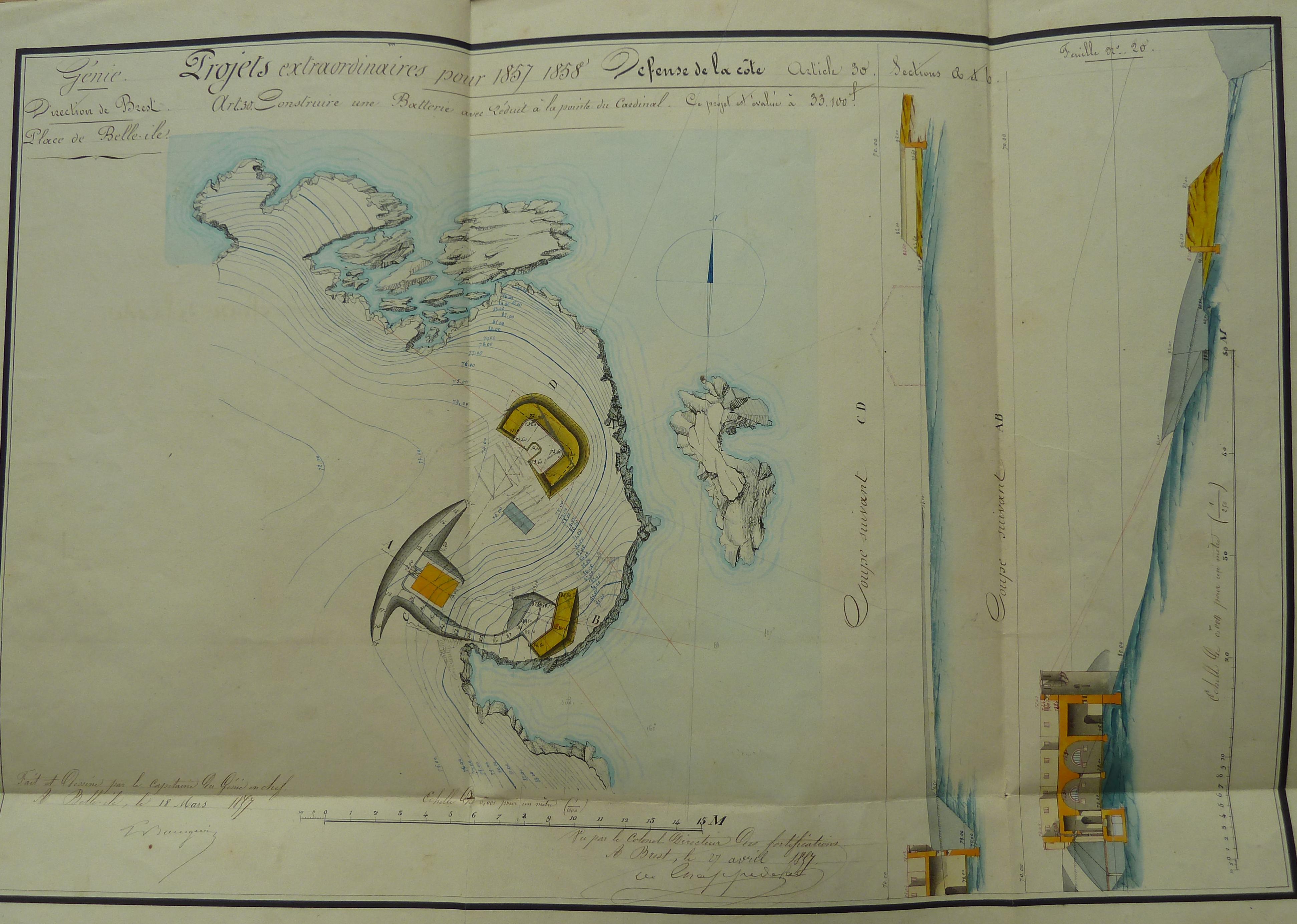 Service historique de la Défense, département Armée de Terre, Vincennes. Archives du Génie ; Article 8, Places françaises et d'Algérie : 1 VH 294, Place de Belle-Île-en-Mer, projets et dépenses annuels, 1854-1857. Direction du Génie de Brest, Place de Belle-Ile, feuille n° 20 des projets extraordinaires pour 1857-1858, 18 mars 1857.