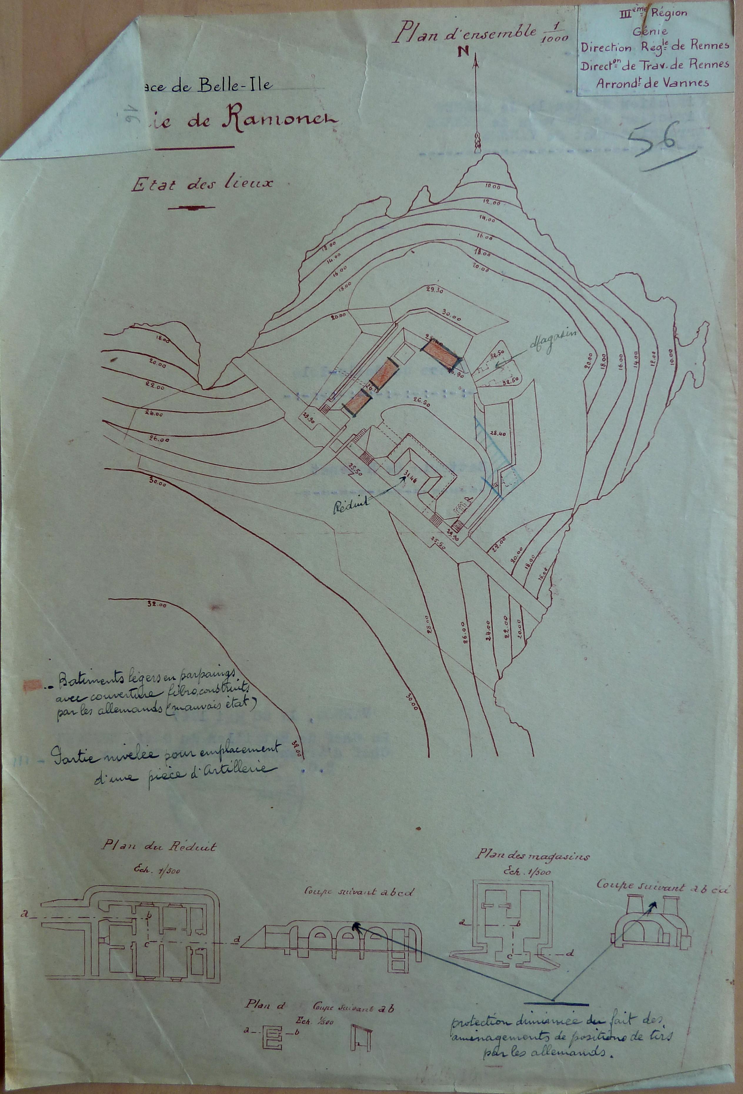 Service historique de la Défense, département Armée de Terre, Vincennes. Archives du Génie ; sous-série 3V, inspection du génie : 3 V 769, Commission de déclassement et d'aliénation d'ouvrages anciens, 1946-1947. Belle-Île, batterie de Ramonette, état des lieux.