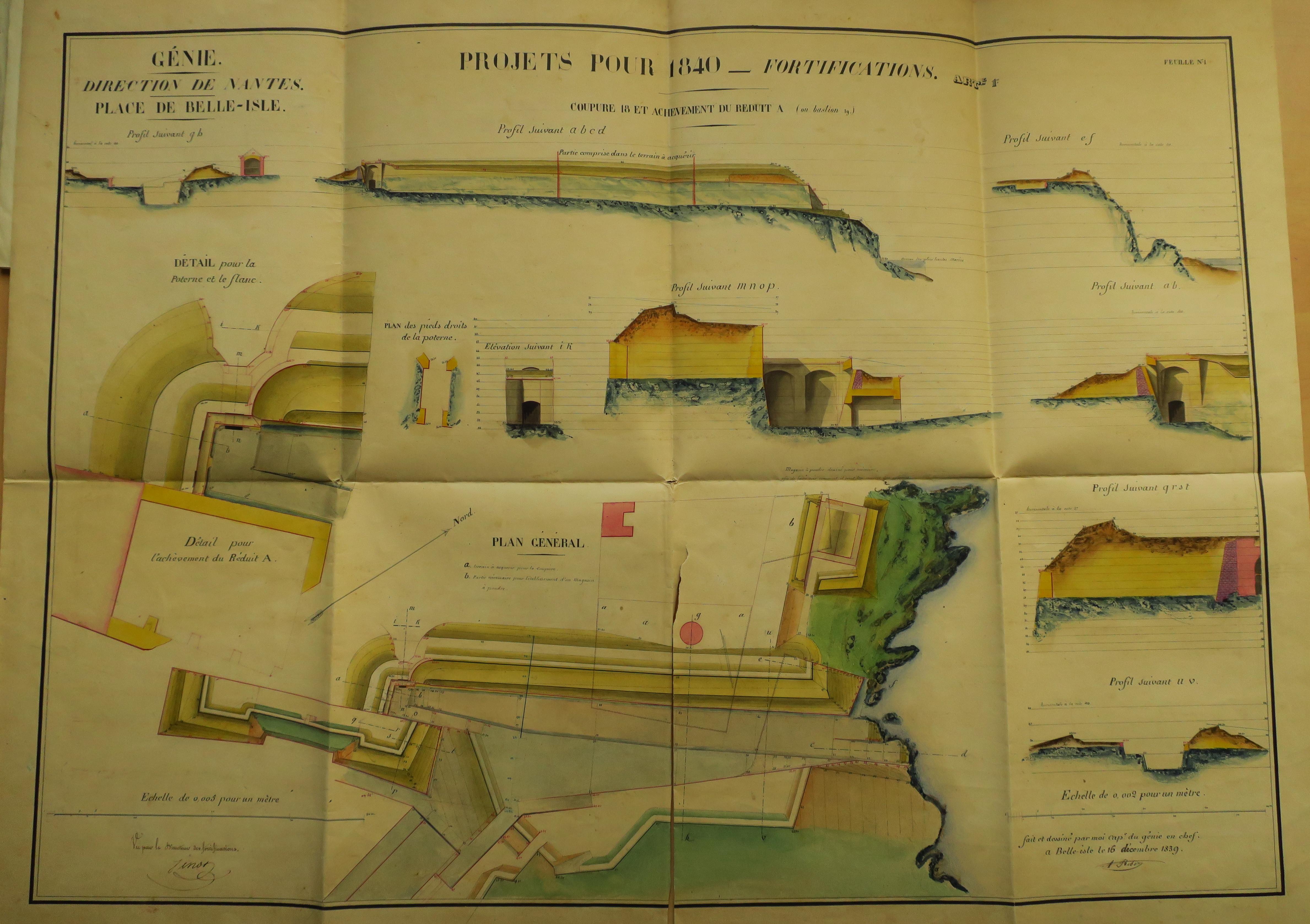 Service historique de la Défense, département Armée de Terre, Vincennes. Archives du Génie ; Article 8, Places françaises et d'Algérie : 1 VH 290, Place de Belle-Île-en-Mer, projets et dépenses annuels, 1837-1842. Direction du Génie de Nantes, Place de Belle-Ile, feuille n° 1 des projets pour 1840, coupure 18 et achèvement du réduit A, 16 décembre 1839.