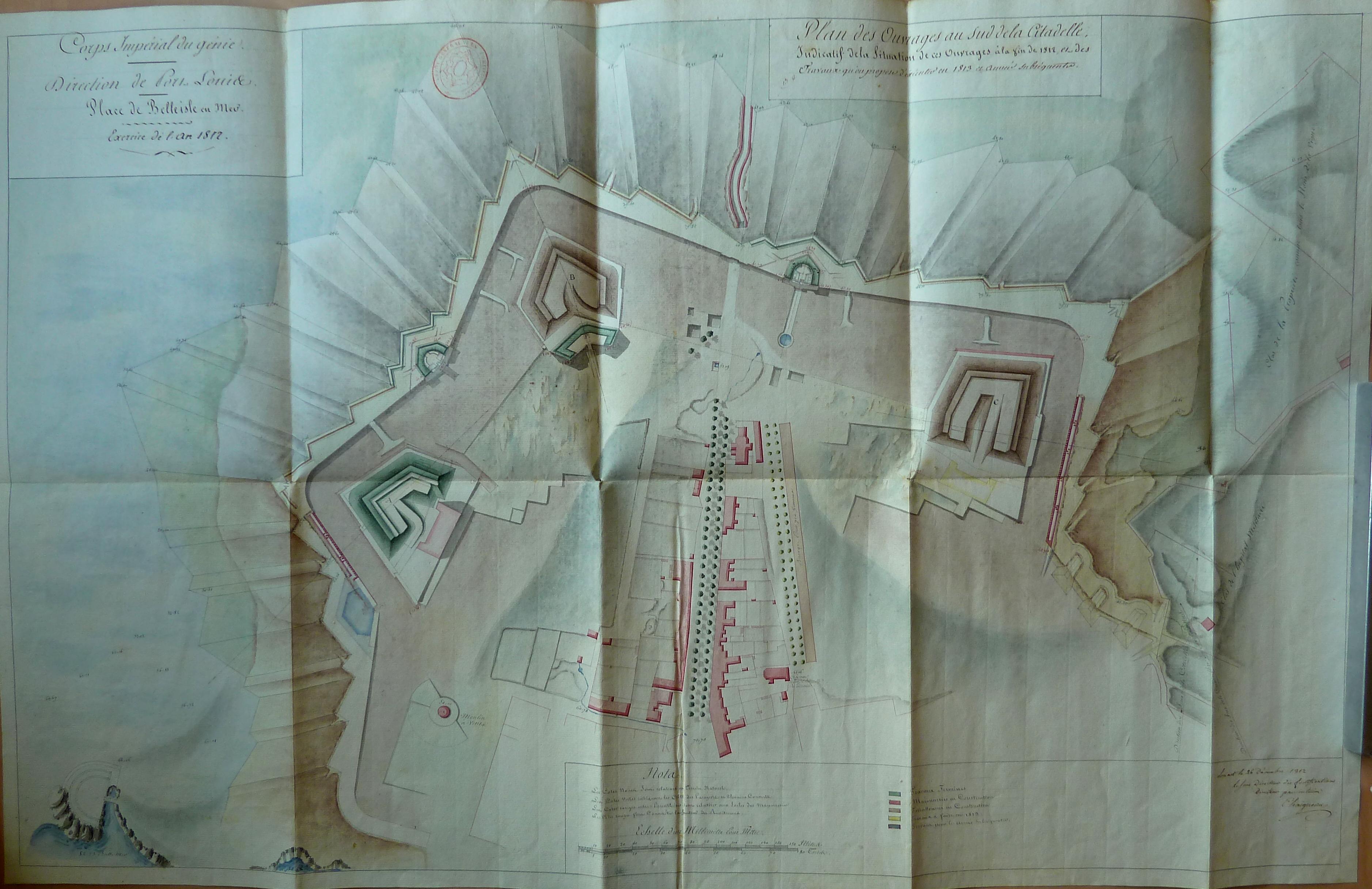 Service historique de la Défense, département Armée de Terre, Vincennes. Archives du Génie ; Article 8, Places françaises et d'Algérie : 1 VH 286, Place de Belle-Île-en-Mer, projets et dépenses annuels, 1807-1816. Direction du Génie de Port-Liberté, Place de Belle-isle-en-Mer, plan des ouvrages au sud de la citadelle, indicatif de la situation de ces ouvrages à la fin de 1812.