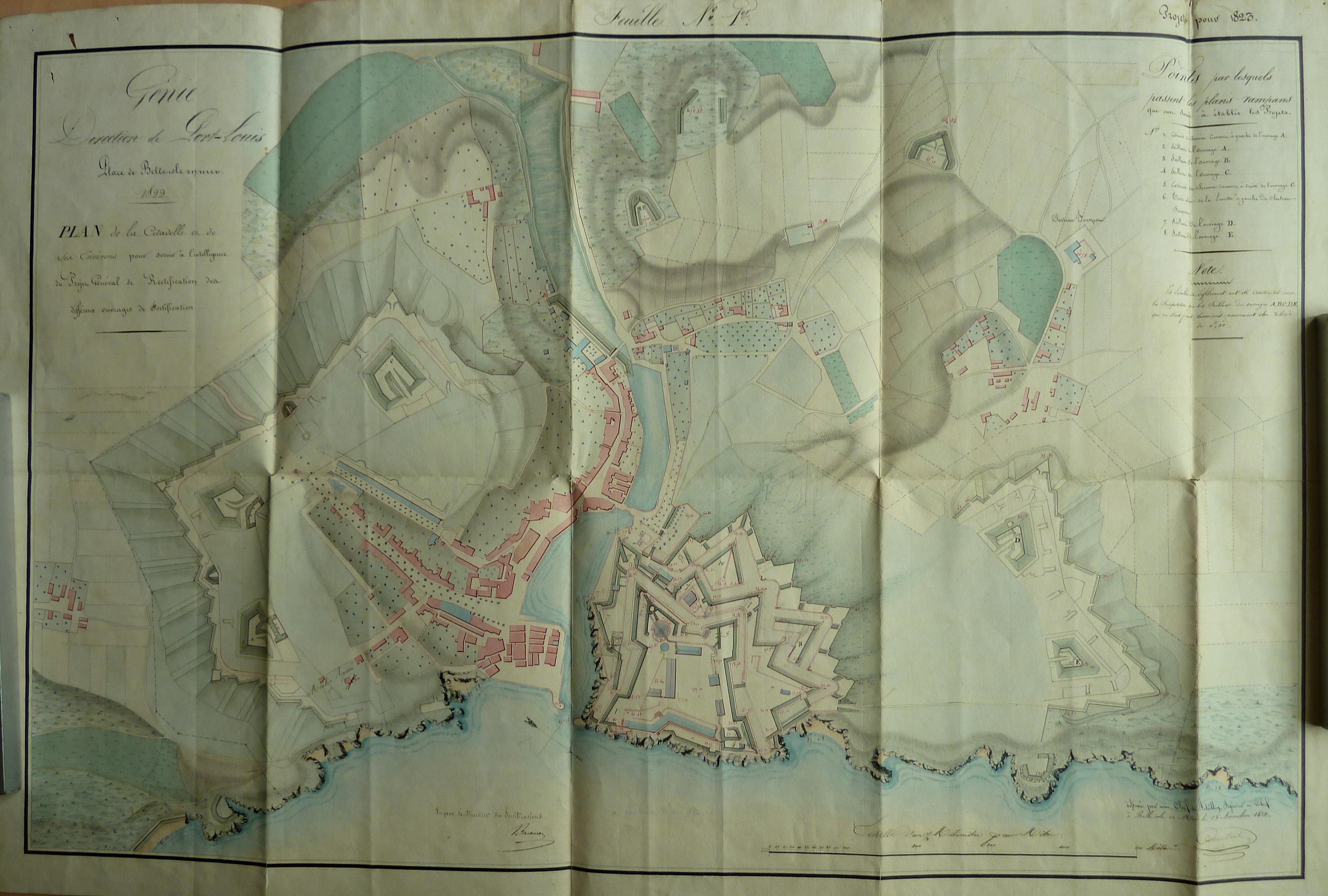 Service historique de la Défense, département Armée de Terre, Vincennes. Archives du Génie ; Article 8, Places françaises et d'Algérie : 1 VH 287, Place de Belle-Île-en-Mer, projets et dépenses annuels, 1817-1825. Direction du Génie de Port-Louis, Place de Belle-isle-en-Mer, projets pour 1823, plan de la citadelle et de ses environs pour servir à l'intelligence du projet général de rectification des différens ouvrages de fortification, 1822.
