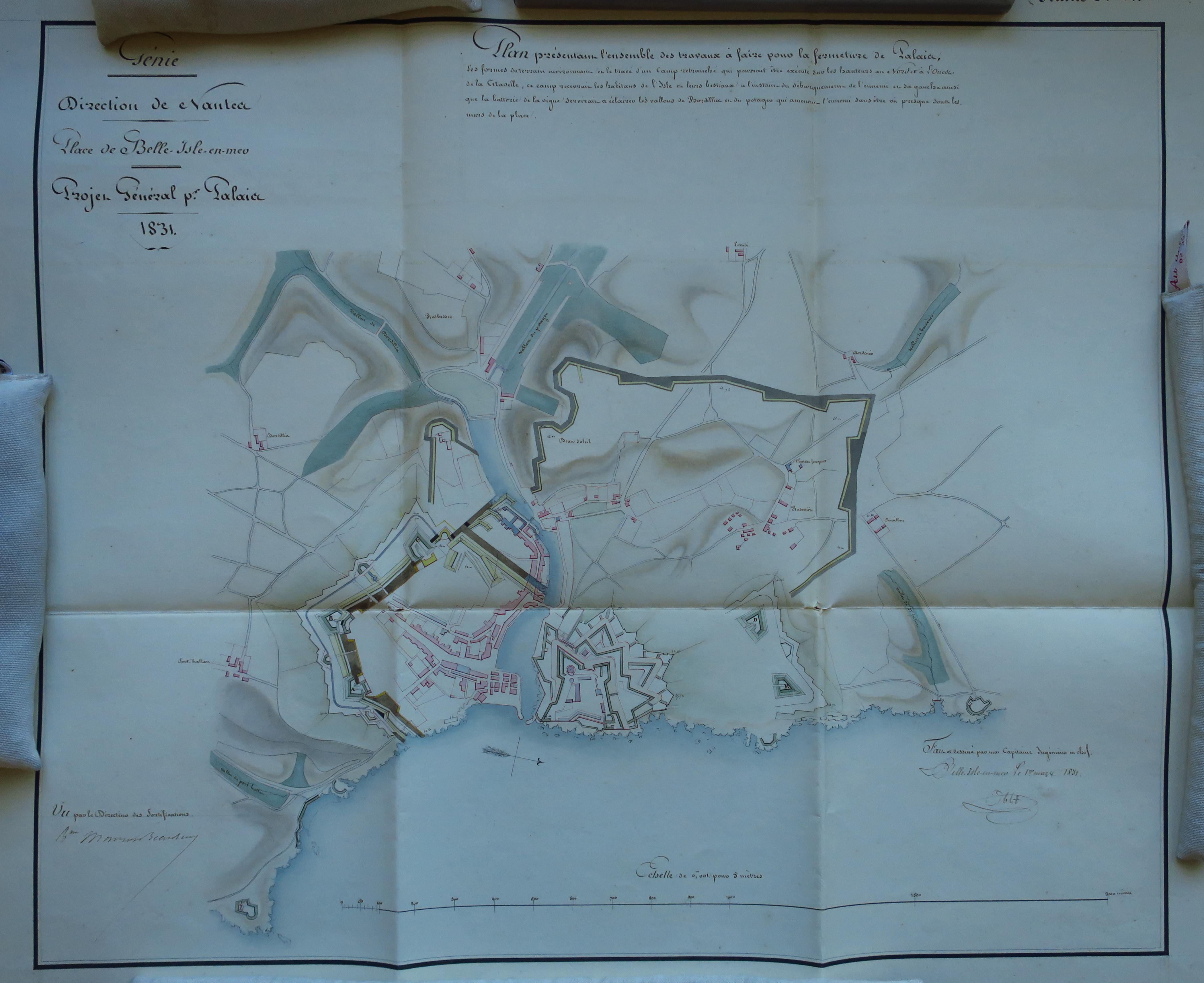 Service historique de la Défense, département Armée de Terre, Vincennes. Archives du Génie ; Article 8, Places françaises et d'Algérie : 1 VH 289, Place de Belle-Île-en-Mer, projets et dépenses annuels, 1831-1836. Direction du Génie de Nantes, Place de Belle-isle-en-Mer, projets pour 1831, plan présentant l'ensemble des travaux à faire pour la fermeture de Palais, 1er mars 1831.
