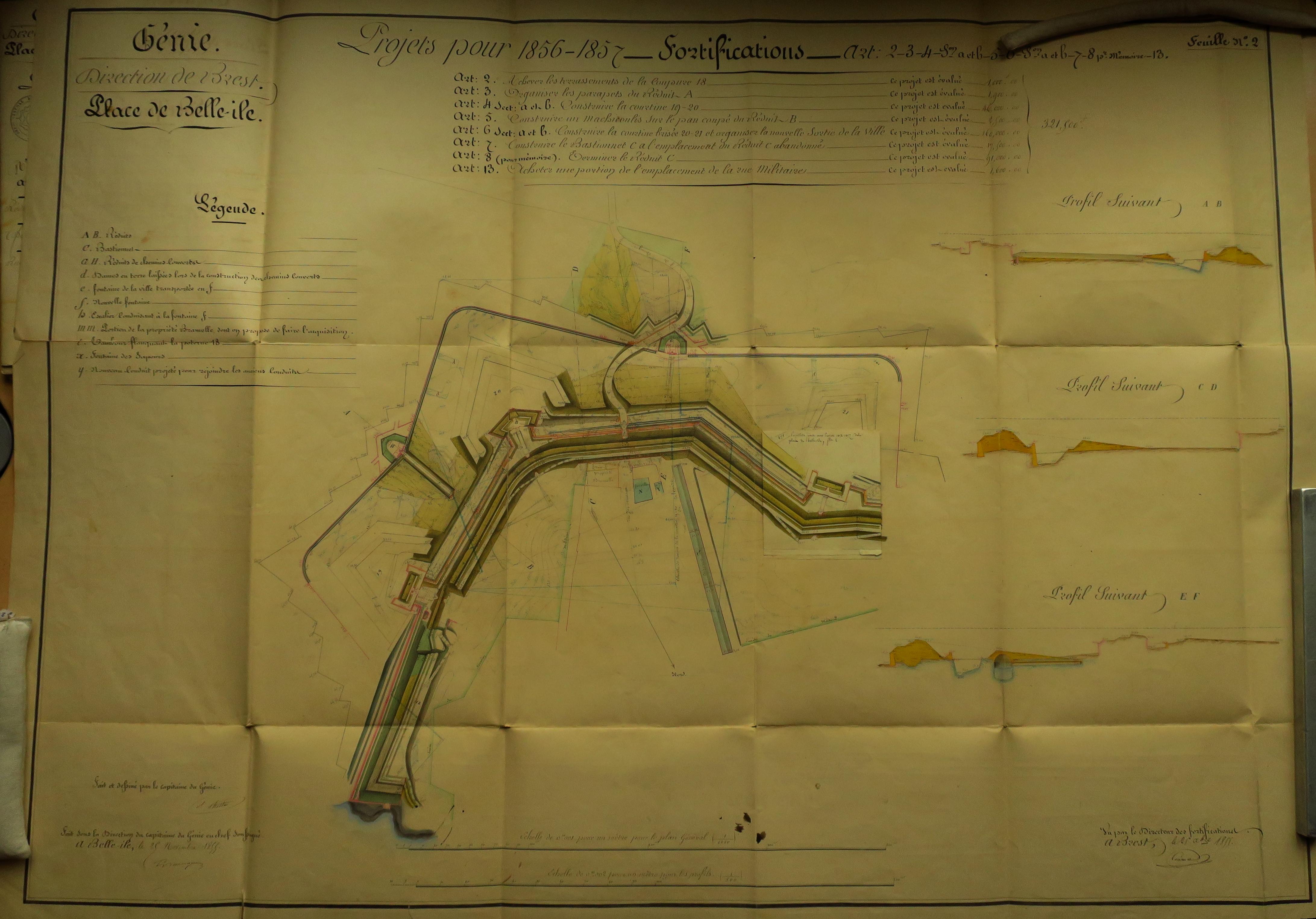 Service historique de la Défense, département Armée de Terre, Vincennes. Archives du Génie ; Article 8, Places françaises et d'Algérie : 1 VH 294, Place de Belle-Île-en-Mer, projets et dépenses annuels, 1854-1857. Direction du Génie de Brest, Place de Belle-Ile, feuille n° 2 des projets pour 1856-1857, 25 novembre 1855.