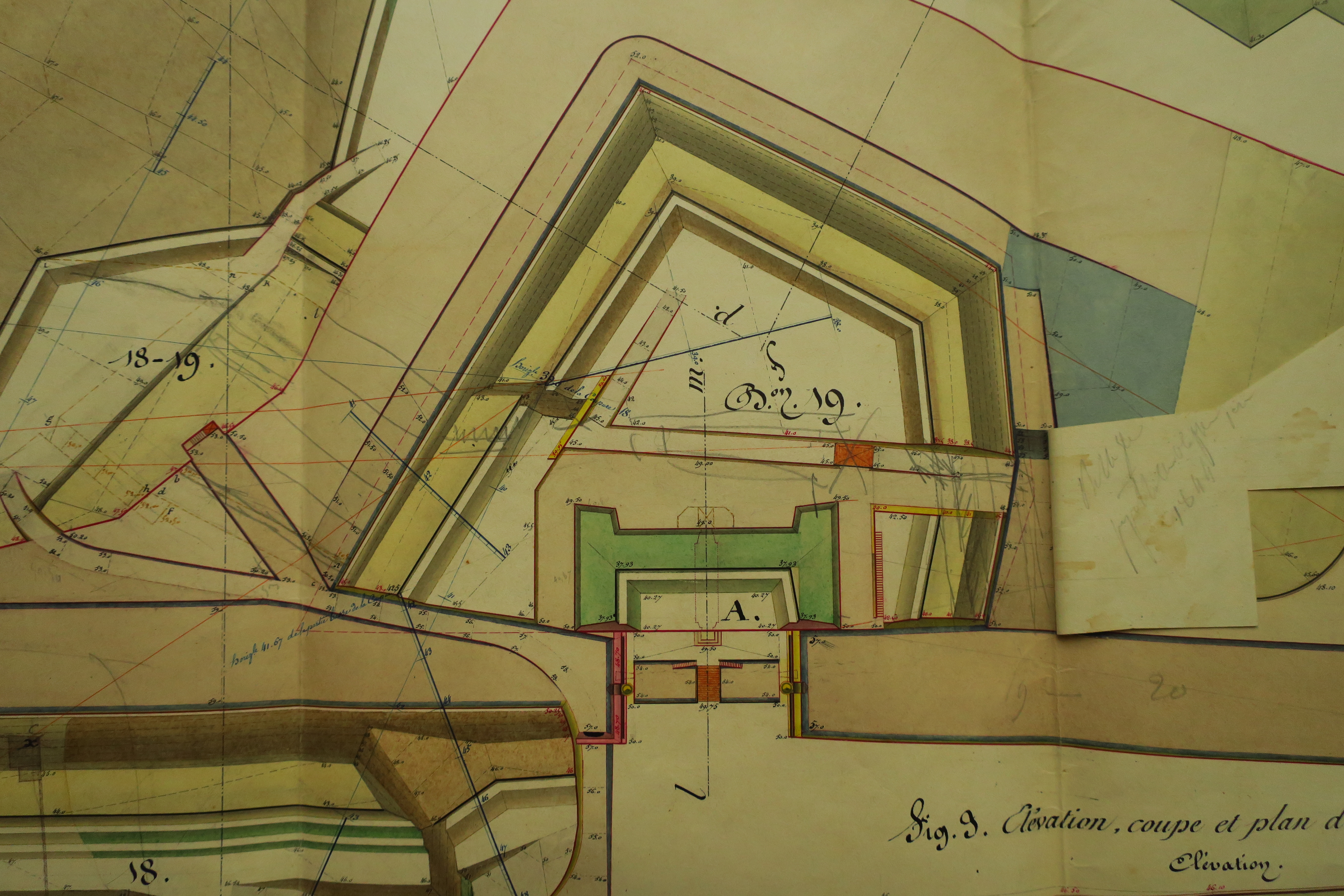 Service historique de la Défense, département Armée de Terre, Vincennes. Archives du Génie ; Article 8, Places françaises et d'Algérie : 1 VH 291, Place de Belle-Île-en-Mer, projets et dépenses annuels, 1843-1846. Direction du Génie de Nantes, Place de Belle-Ile, feuille n° 1 des projets pour 1844, coupure 18, bastion 19, galerie de contrescarpe, 16 février 1844.