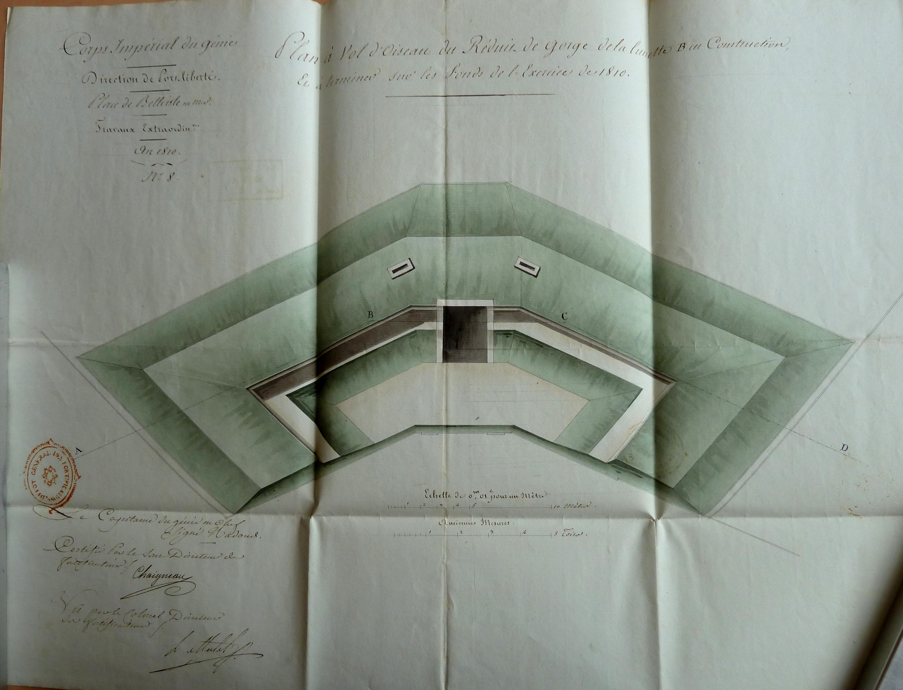 Service historique de la Défense, département Armée de Terre, Vincennes. Archives du Génie ; Article 8, Places françaises et d'Algérie : 1 VH 286, Place de Belle-Île-en-Mer, projets et dépenses annuels, 1807-1816. Direction du Génie de Port-Louis, Place de Belle-isle-en-mer, feuille n° 8 des projets pour 1810, plan à vol d'oiseau du réduit de gorge de la lunette B en construction.