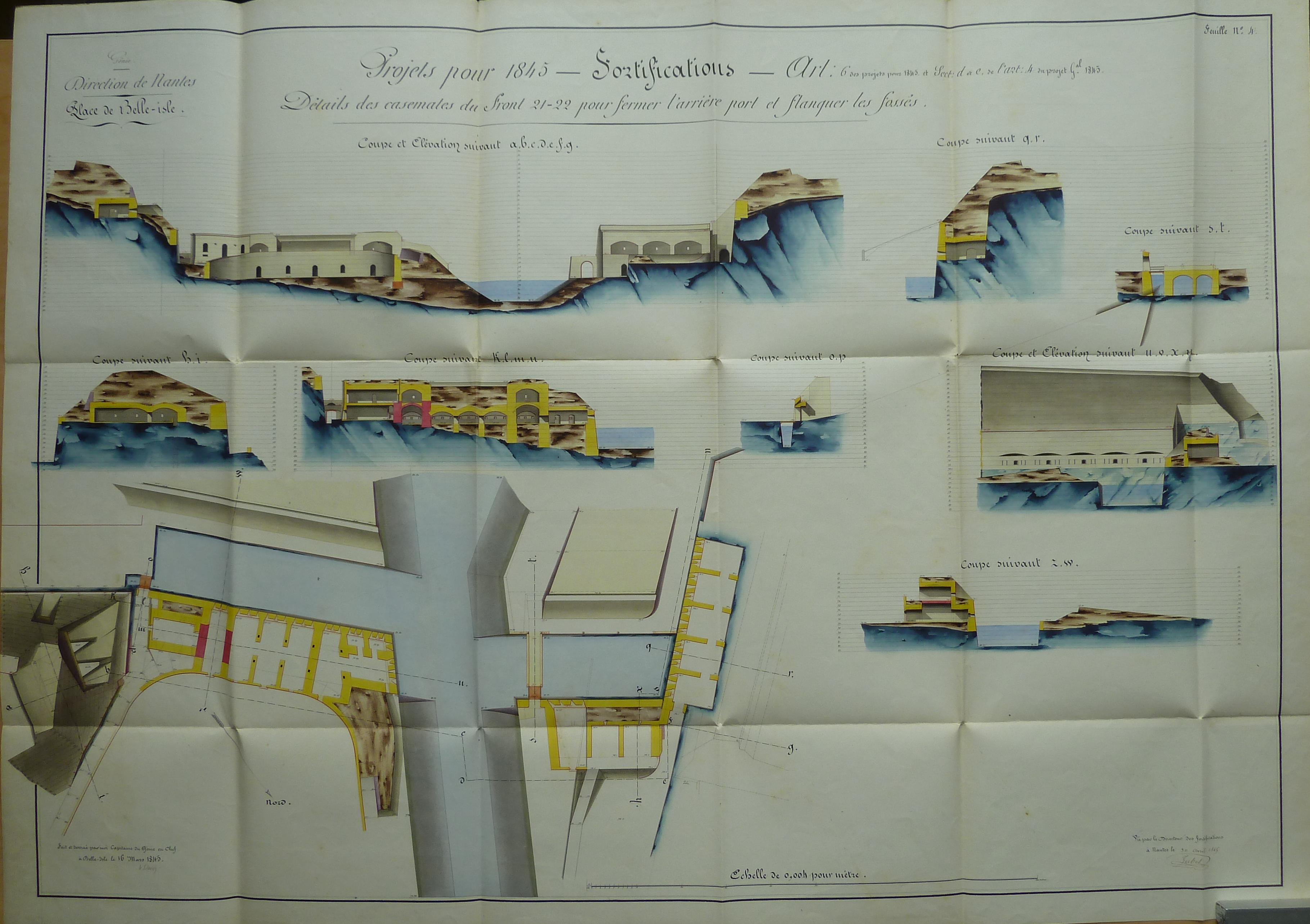 Service historique de la Défense, département Armée de Terre, Vincennes. Archives du Génie ; Article 8, Places françaises et d'Algérie : 1 VH 291, Place de Belle-Île-en-Mer, projets et dépenses annuels, 1843-1846. Direction du Génie de Nantes, Place de Belle-Ile, feuille n° 4 des projets pour 1845, détails des casemates du front 21-22 pour fermer l'arrière-port et flanquer les fossés, 16 mars 1845.