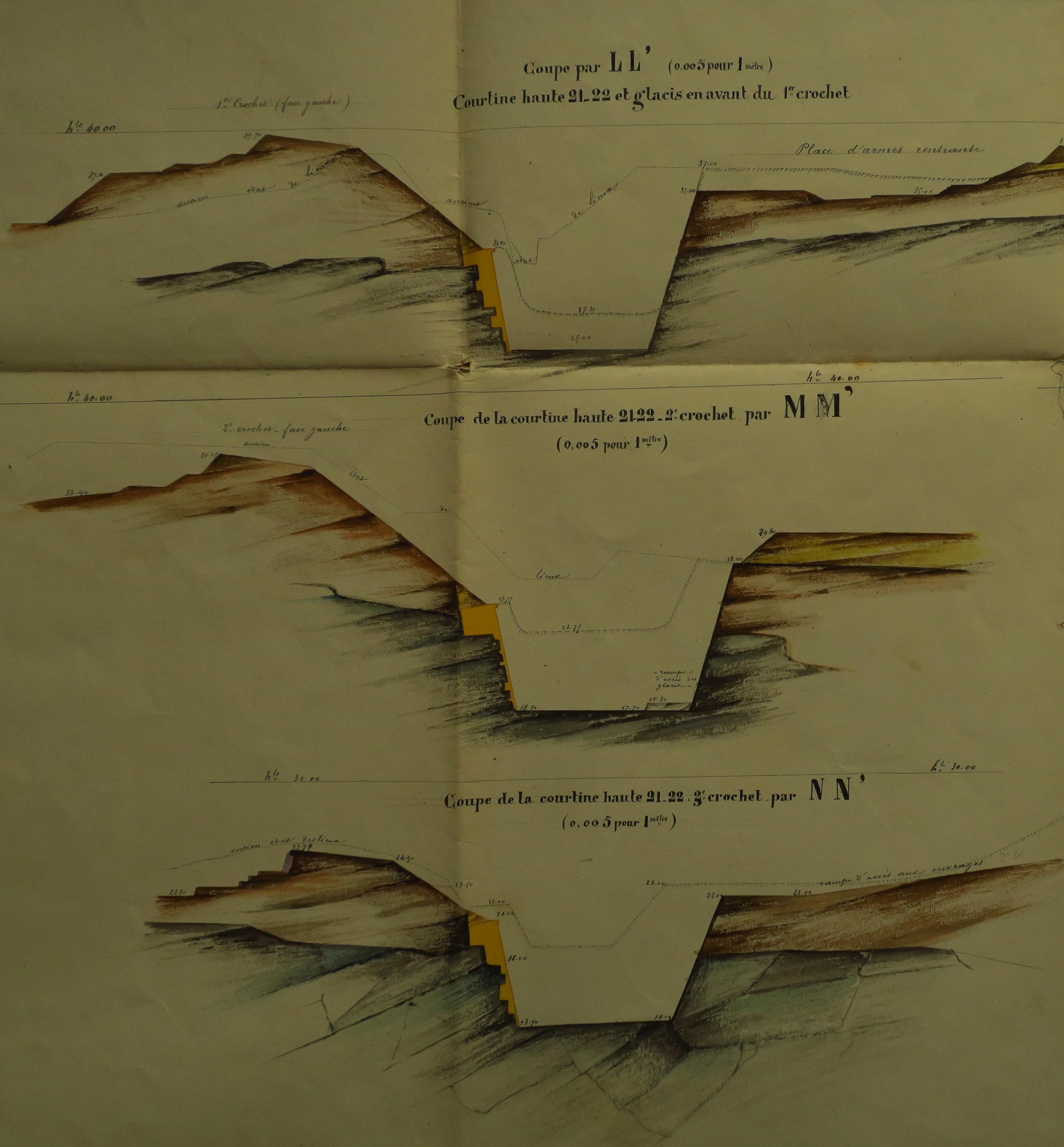 Service historique de la Défense, département Armée de Terre, Vincennes. Archives du Génie ; Article 8, Places françaises et d'Algérie : 1 VH 297, Place de Belle-Île-en-Mer, projets et dépenses annuels, 1862-1875. Direction du Génie de Brest, Place de Belle-Ile, feuille n° 4 des projets pour 1866-1867, courtine 21-22, 7 mars 1866.