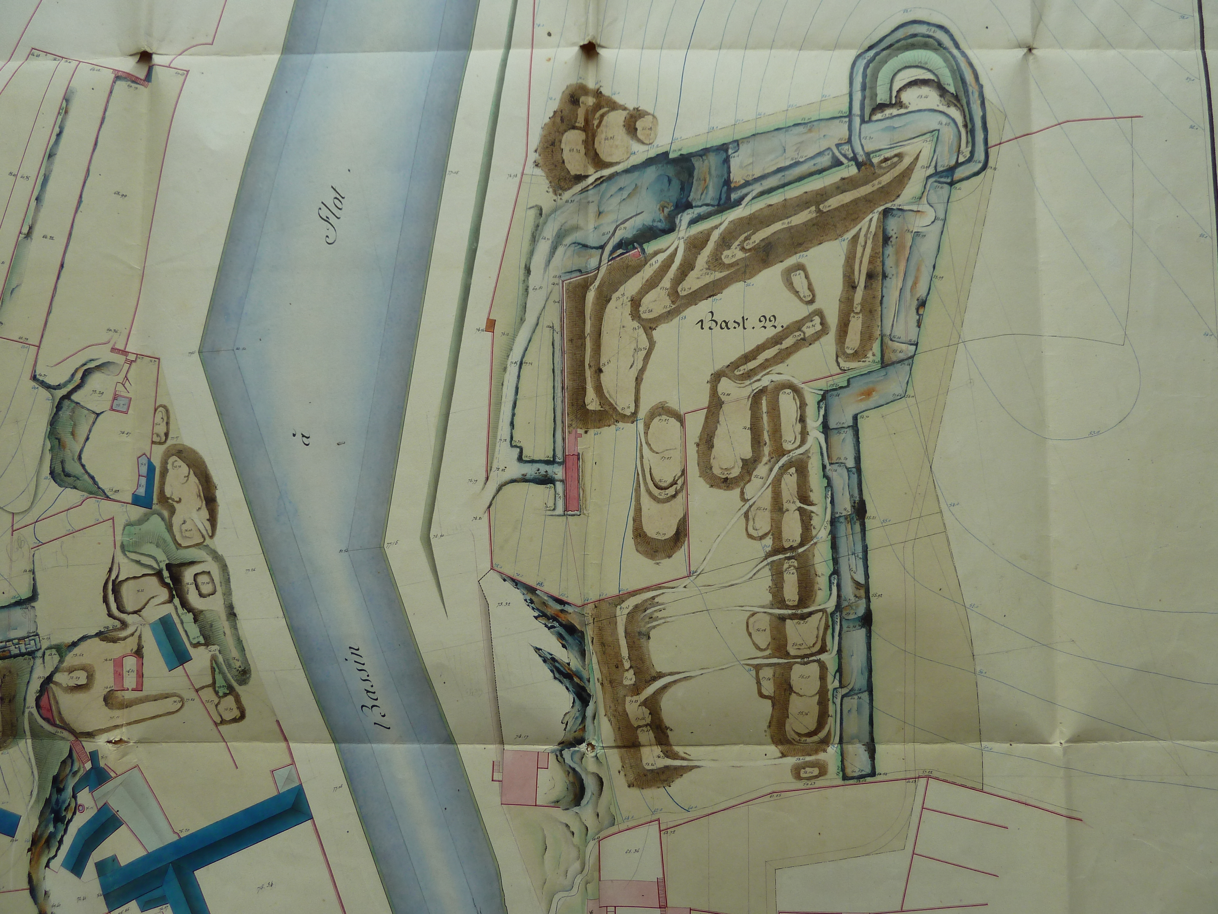 Service historique de la Défense, département Armée de Terre, Vincennes. Archives du Génie ; Article 8, Places françaises et d'Algérie : 1 VH 291, Place de Belle-Île-en-Mer, projets et dépenses annuels, 1843-1846. Direction du Génie de Nantes, Place de Belle-Ile, feuille n° 5 des projets pour 1845, état des lieux du front 21-22 ou C et Beausoleil, 16 août 1843.
