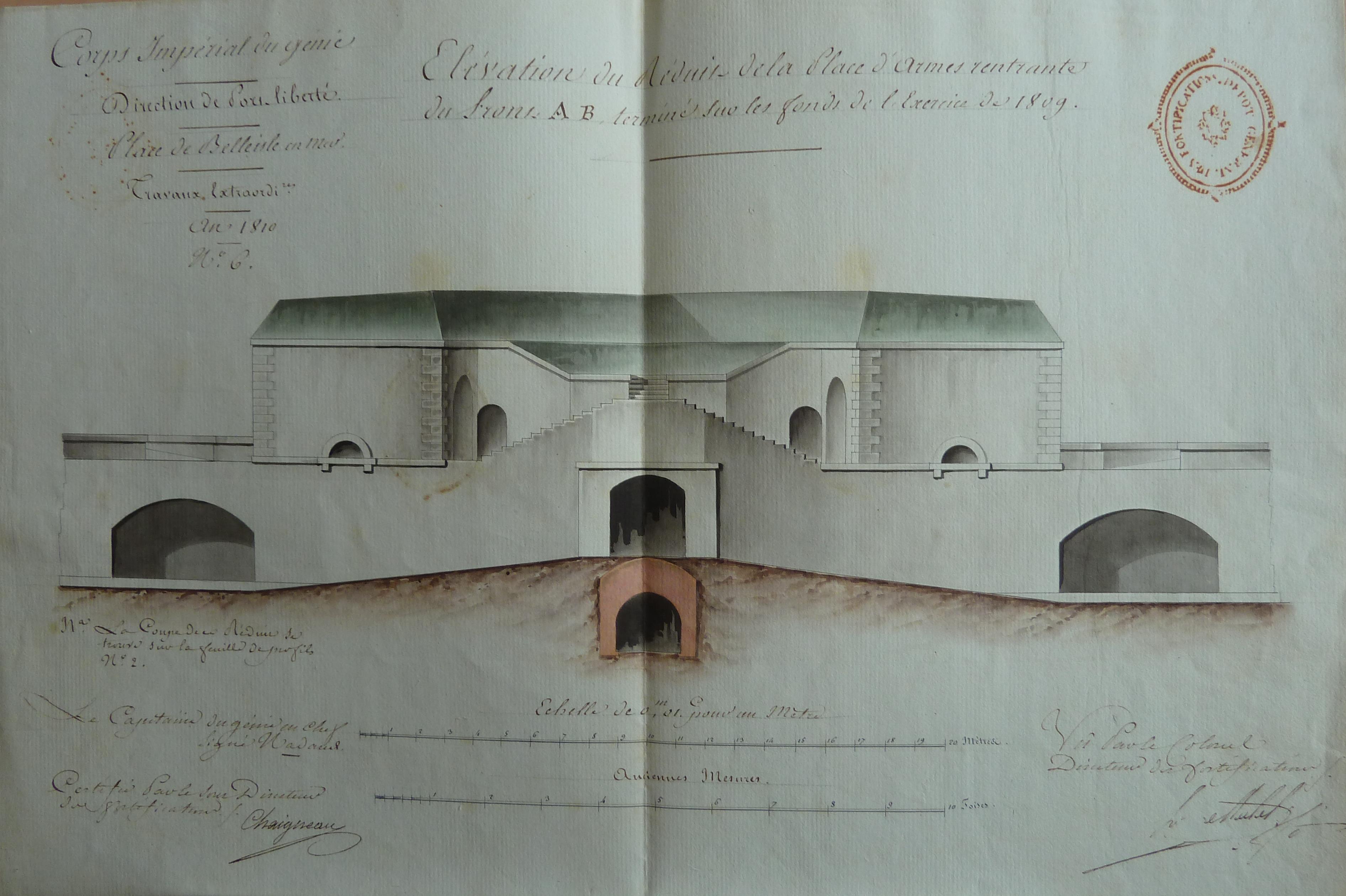 Service historique de la Défense, département Armée de Terre, Vincennes. Archives du Génie ; Article 8, Places françaises et d'Algérie : 1 VH 286, Place de Belle-Île-en-Mer, projets et dépenses annuels, 1807-1816. Direction du Génie de Port-Liberté, Place de Belle-Isle, élévation du réduit de la place d'armes rentrante du chemin couvert du front AB terminé sur les fonds de l'exercice 1809, 1810.