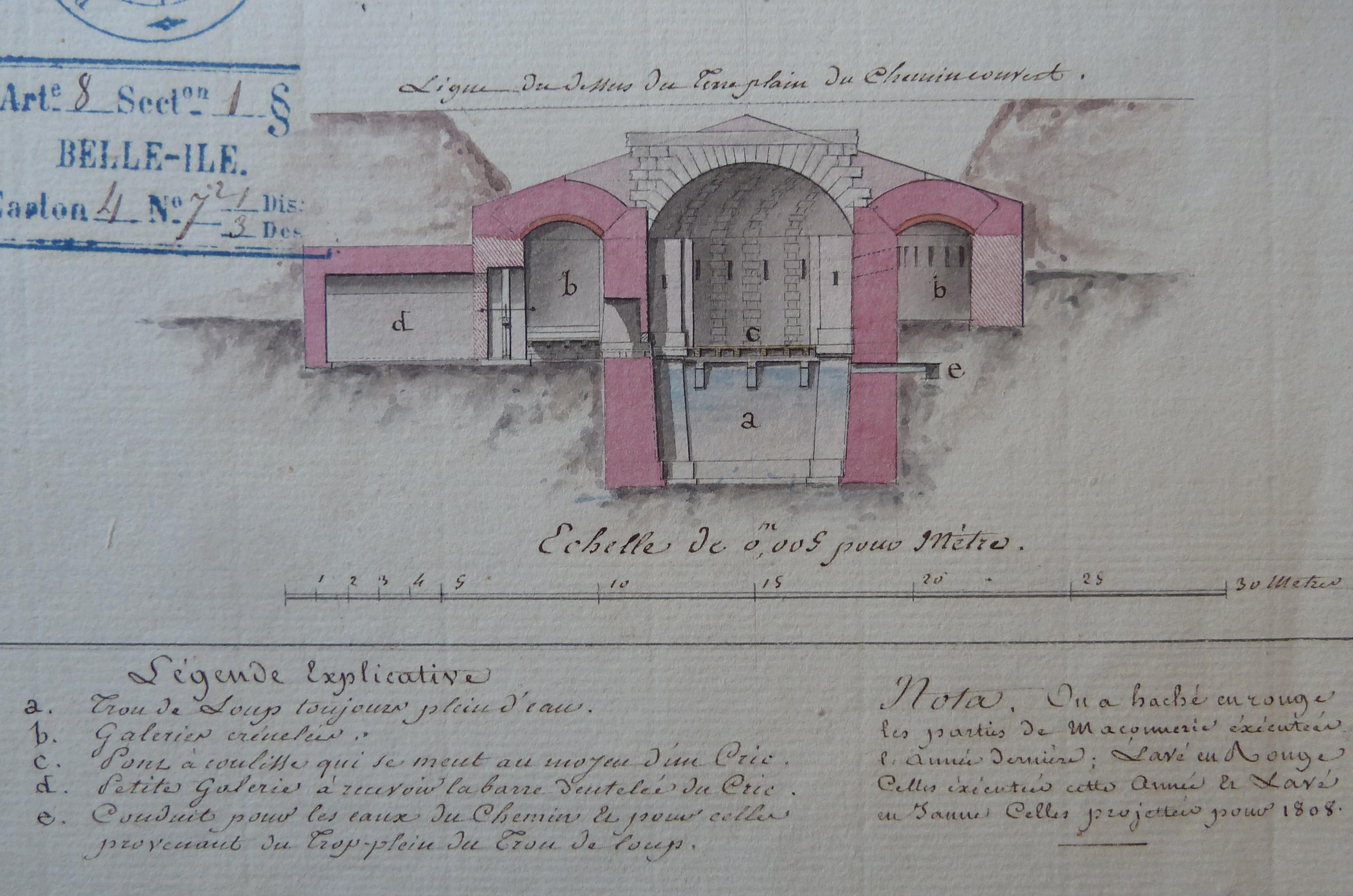 Service historique de la Défense, département Armée de Terre, Vincennes. Archives du Génie ; Article 8, Places françaises et d'Algérie : 1 VH 286, Place de Belle-Île-en-Mer, projets et dépenses annuels, 1807-1816. Direction du Génie de Port-Liberté, ouvrages défensifs de Belle-Ile, porte de Bangor, 2 novembre 1807.