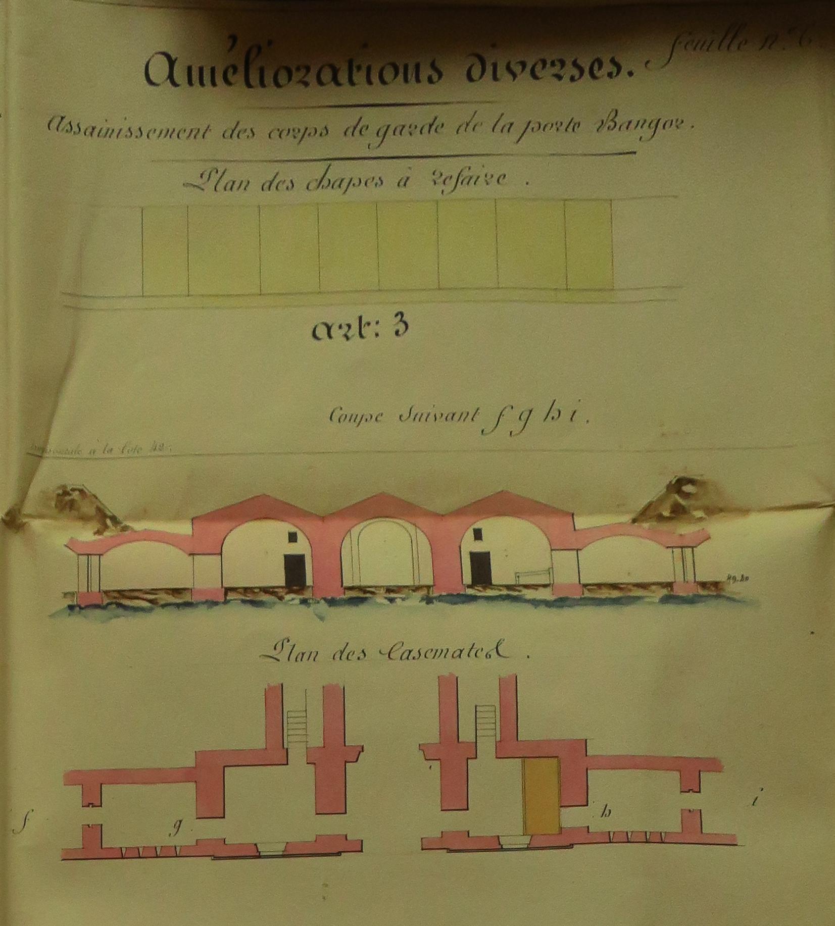 Service historique de la Défense, département Armée de Terre, Vincennes. Archives du Génie ; Article 8, Places françaises et d'Algérie : 1 VH 291, Place de Belle-Île-en-Mer, projets et dépenses annuels, 1843-1846. Direction du Génie de Nantes, Place de Belle-Ile, feuille n° 6 des projets pour 1843, bâtiments militaires, améliorations diverses, 29 mars 1843.