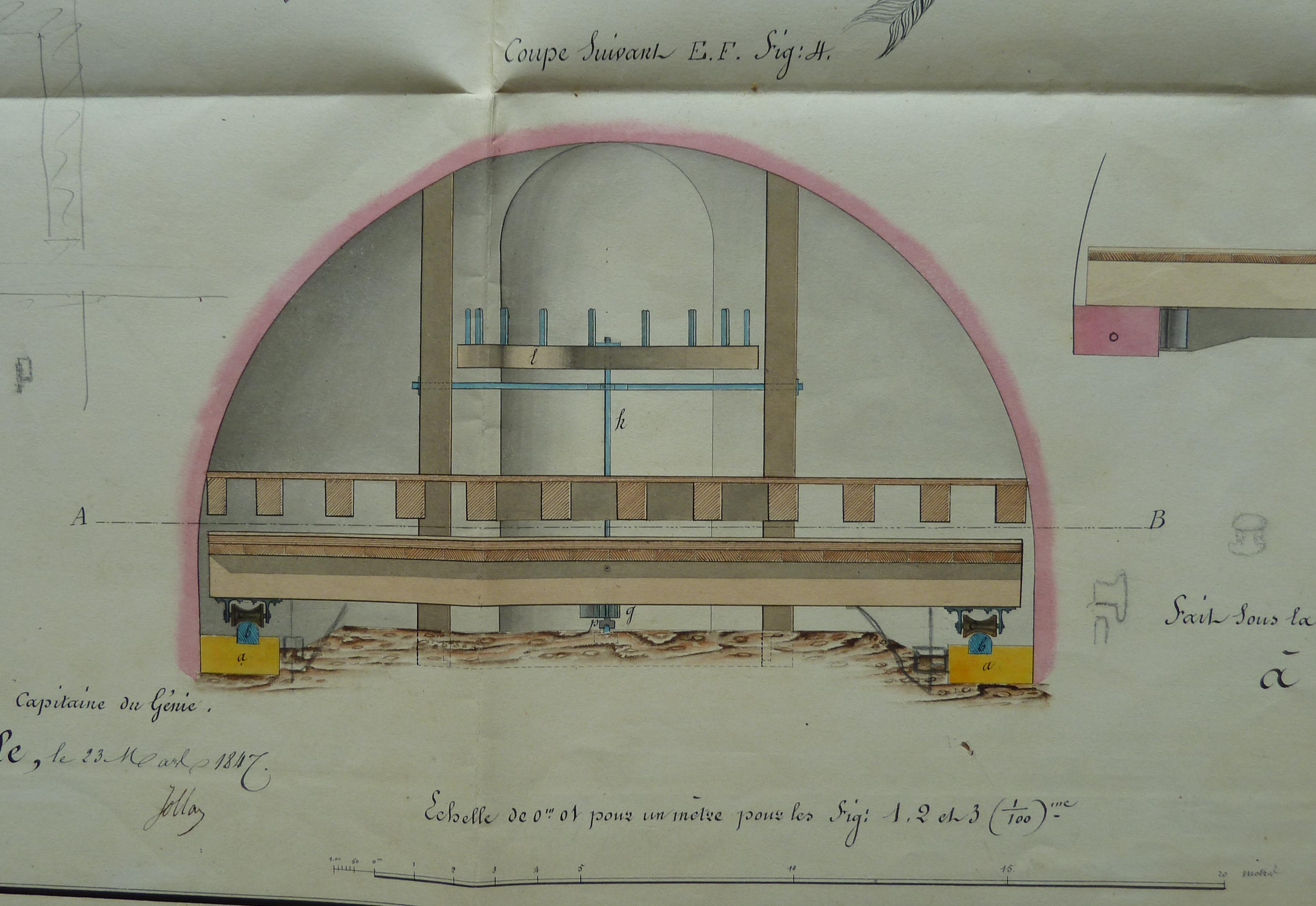 Service historique de la Défense, département Armée de Terre, Vincennes. Archives du Génie ; Article 8, Places françaises et d'Algérie : 1 VH 292, Place de Belle-Île-en-Mer, projets et dépenses annuels, 1847. Direction du Génie de Nantes, Place de Belle-Ile, feuille n° 29 des projets pour 1847, refaire le pont-levis de la porte Bangor, 23 mars 1847.