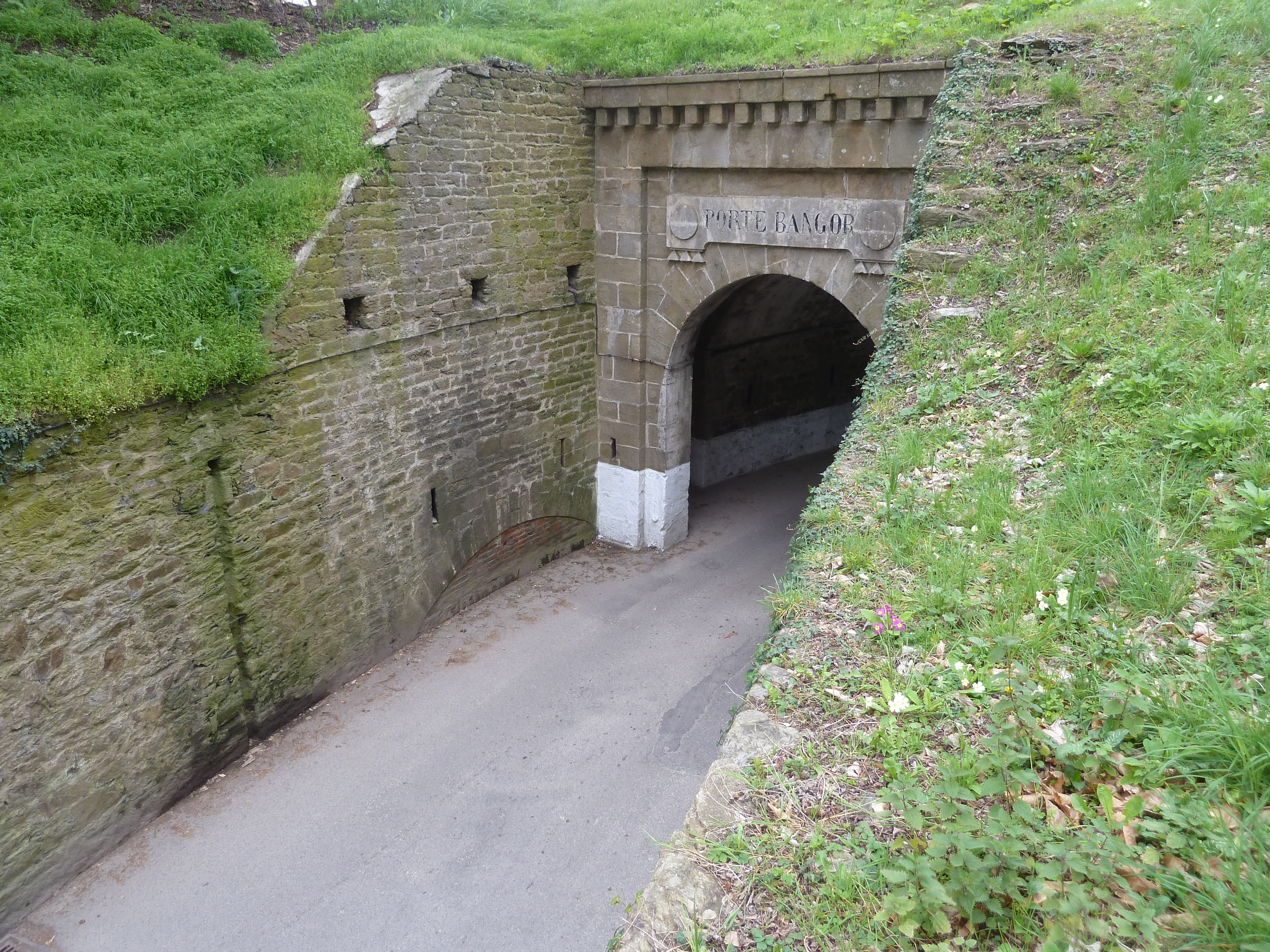 Le Palais, enceinte urbaine, porte de Bangor, débouché côté campagne ; à gauche de la porte, arc du logement de l'ancien pont coulissant.Immatriculation