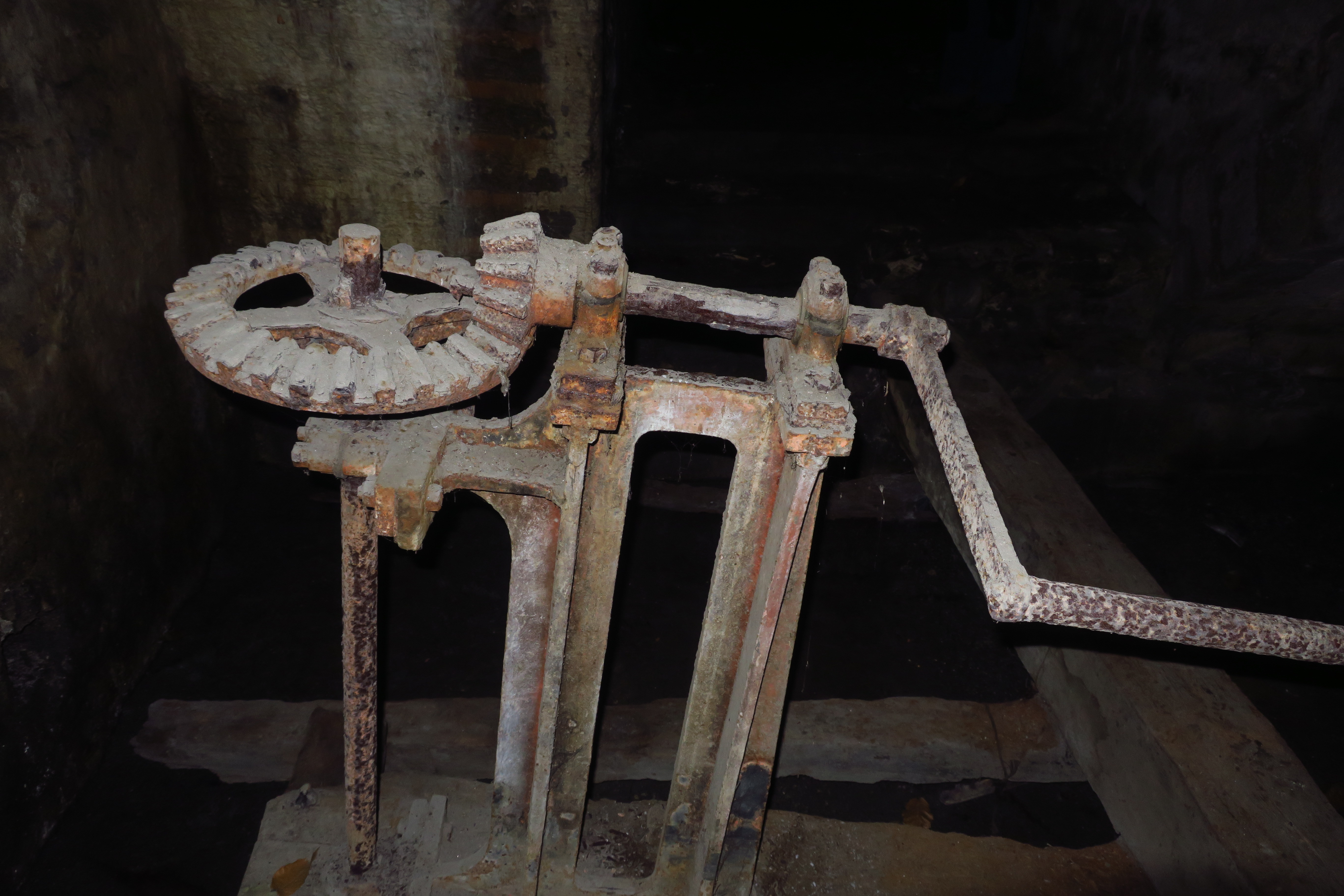Le Palais, enceinte urbaine, porte de Bangor, chambre de manoeuvre du pont coulissant, détail du mécanisme.Immatriculation