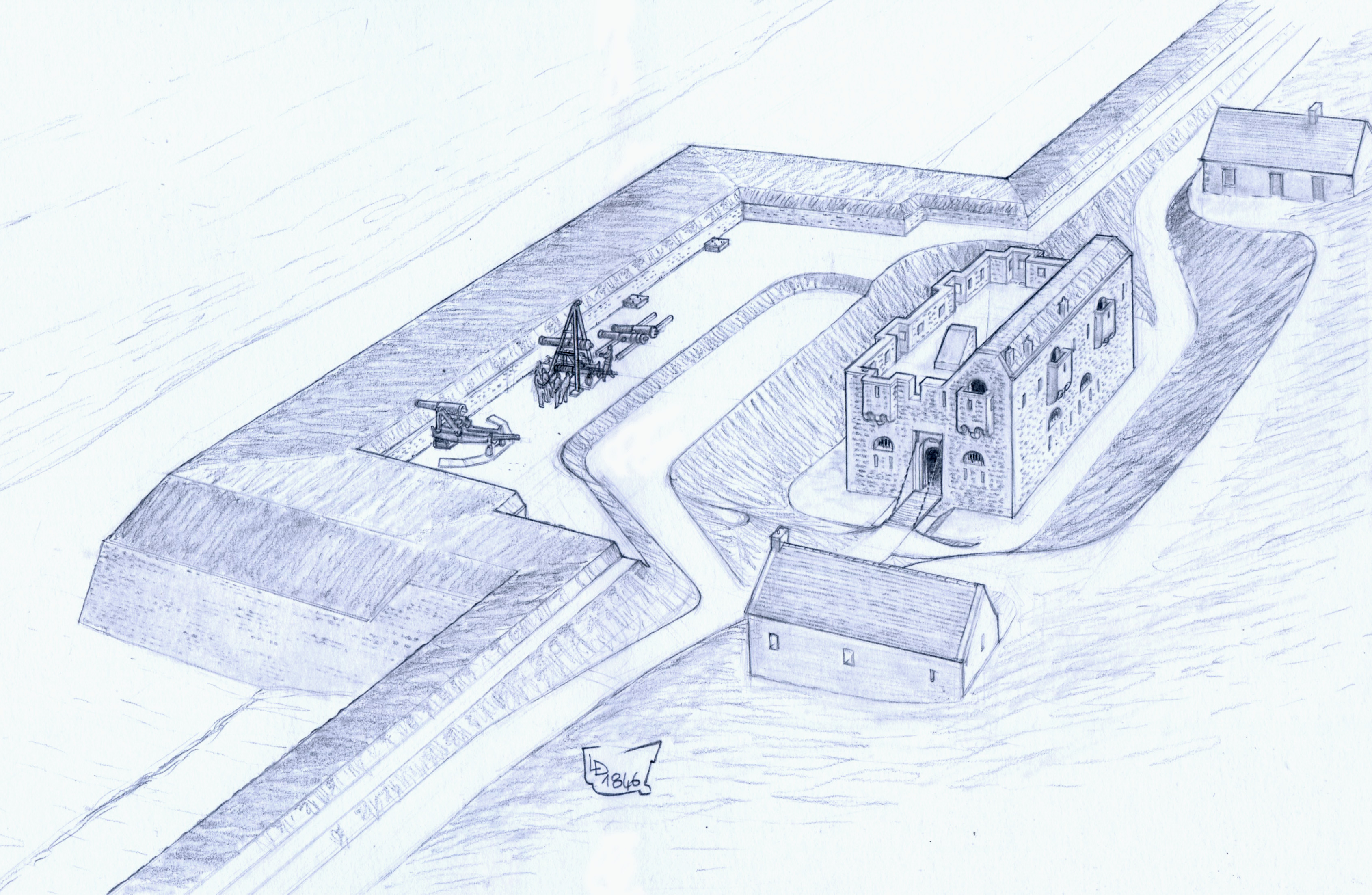 Locmaria, batterie de la Ferrière, évocation vers 1870 avec l'artillerie en place, par Lionel Duigou.Immatriculation