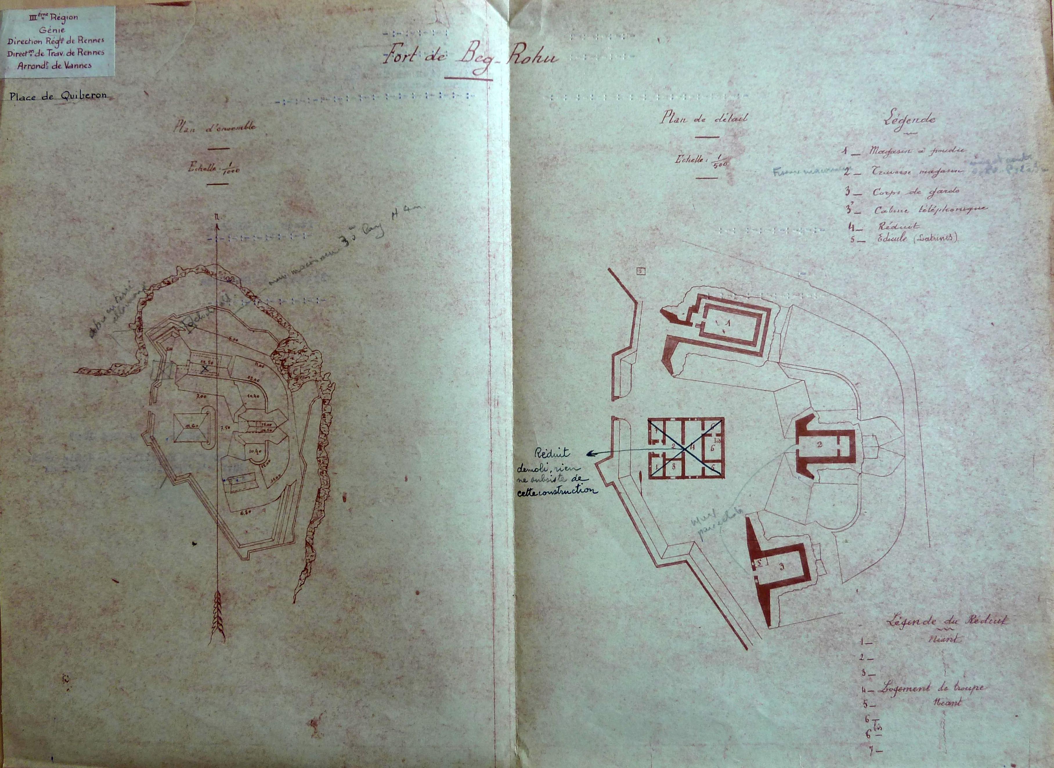 Service historique de la Défense, département Armée de Terre, Vincennes. Archives du Génie ; sous-série 3V, inspection du génie : 3 V 769, Commission de déclassement et d'aliénation d'ouvrages anciens, 1946-1947. Quiberon, batterie de Beg Rohu.