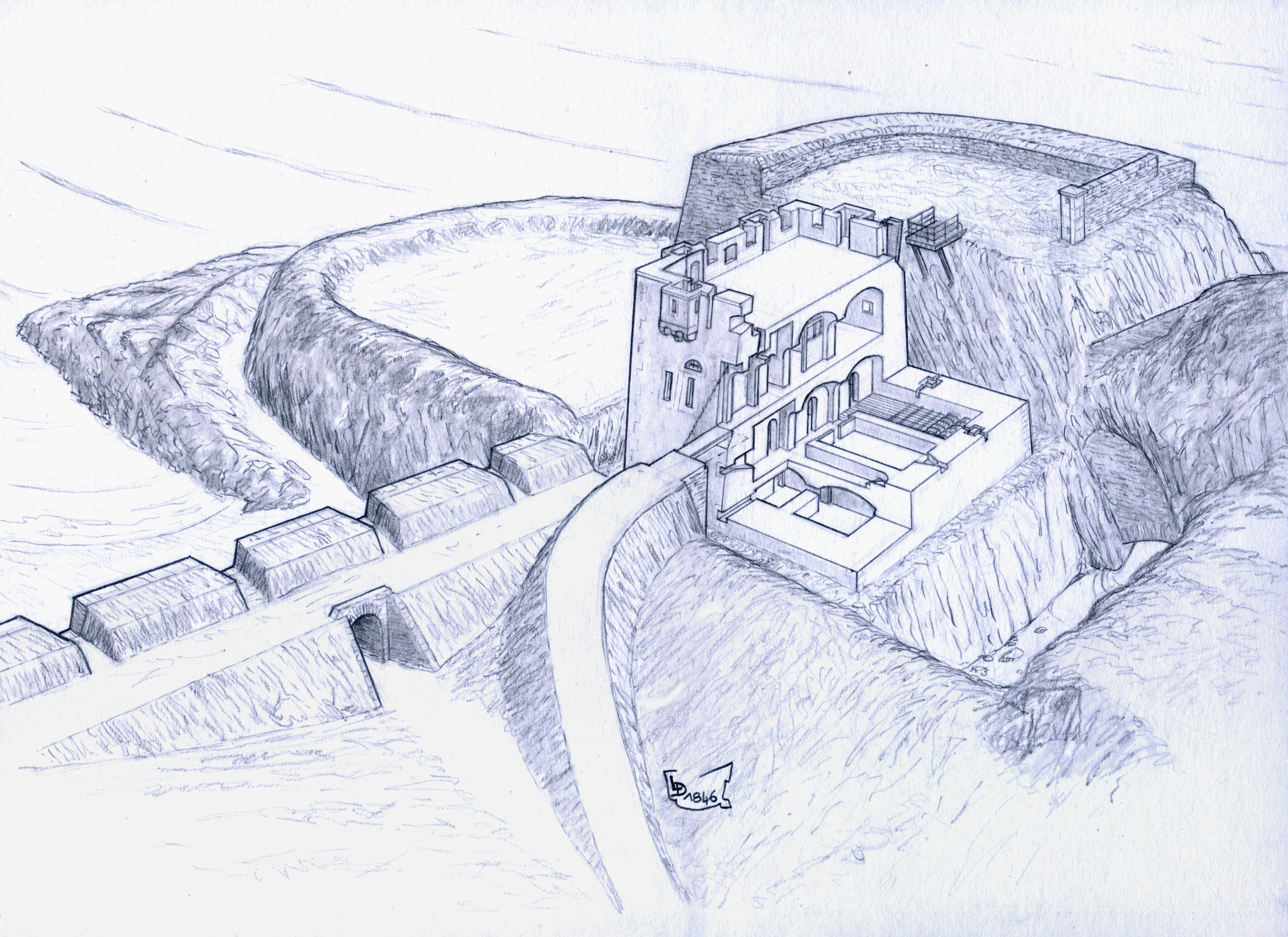 Locmaria, Port Andro, évocation de la tour crénelée vers 1870, par Lionel Duigou.Immatriculation