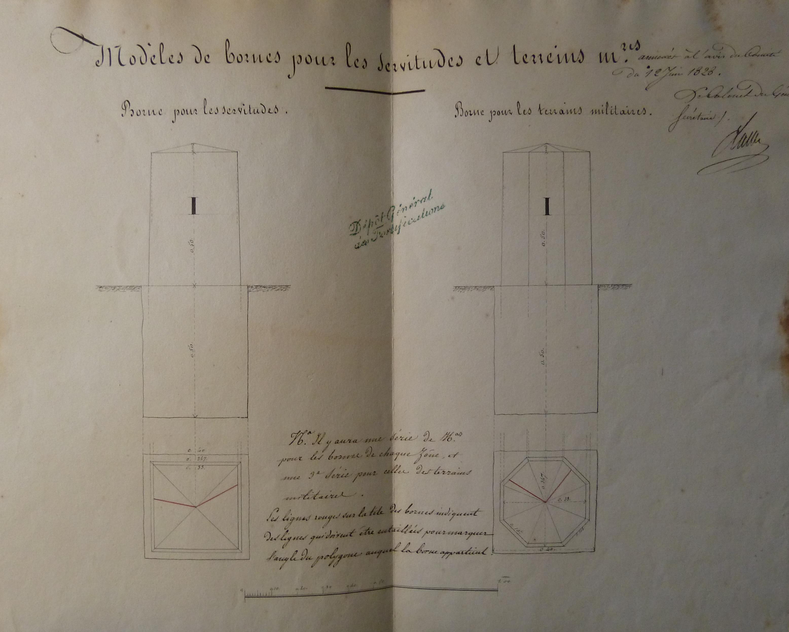 Service historique de la Défense, département Armée de Terre, Vincennes. Archives du Génie ; Article 12, Avis du Comité : 1 VK 139, Objets d'art : notes, mémoires et croquis de types (modèles) annexés aux avis du Comité du génie. Modèles de bornes pour les servitudes et terreins m[ilitai]res, 12 juin 1828.