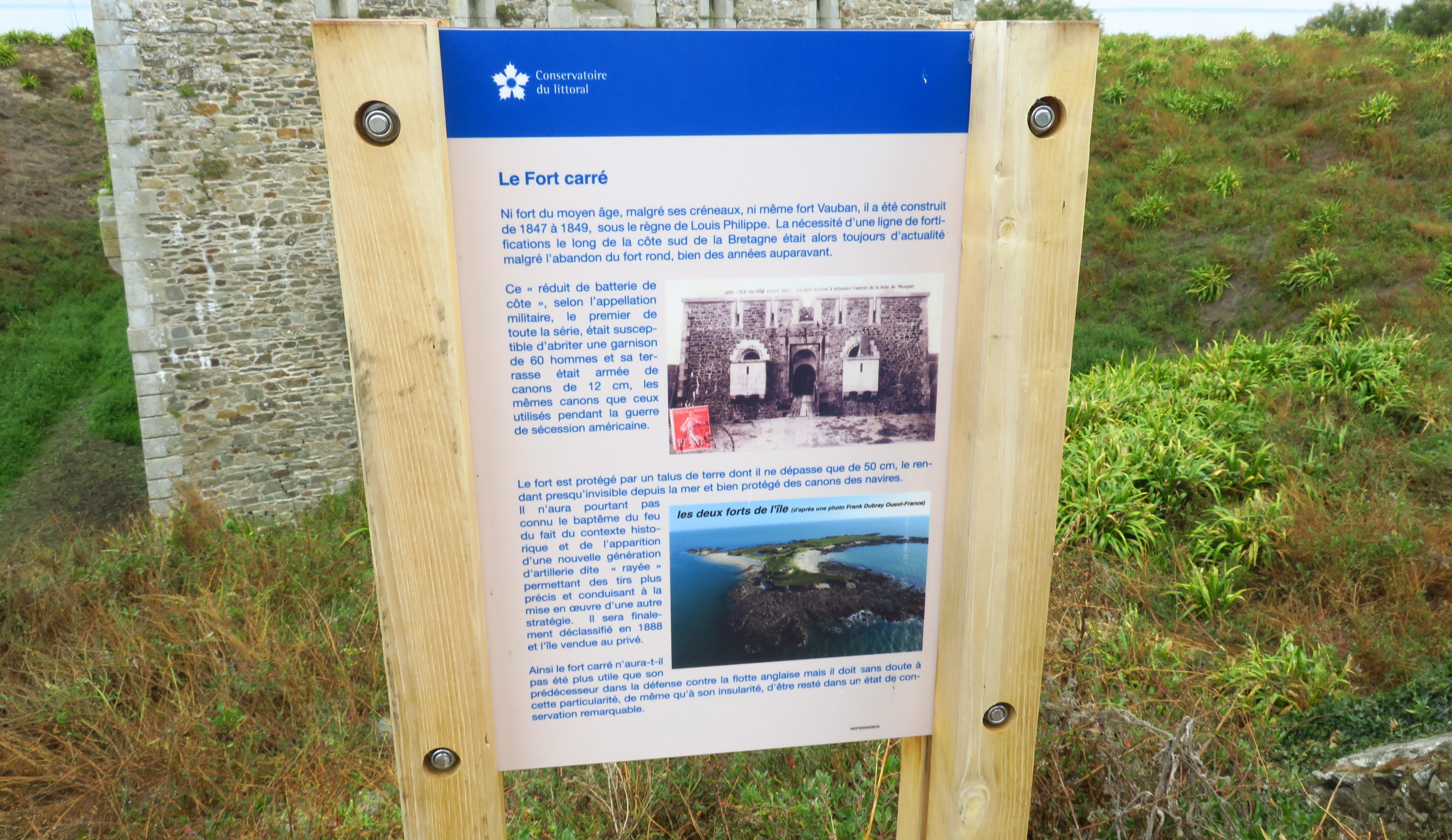 Île Dumet, batterie et tour crénelée, signalétique du Conservatoire du littoral.Immatriculation
