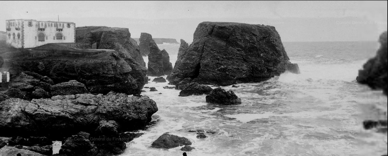 Archives départementales du Finistère. Série Fi, Documents figurés entrés par voie extraordinaire ; Sous-série 21 Fi, Fonds Villard : 21 Fi 1762, Belle-Île, La côte et le fort Sarah Bernhardt, vers 1900.
